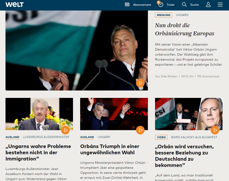 Egy másik Welt-anyagban a lap budapesti tudósítója, Boris Kálnoky arról számolt be, hogy Orbán Viktor a jövőben valószínűleg arra készül, hogy jobb kapcsolatot alakítson ki Angela Merkellel és Németországgal. A magyar kormány EU-politikájában nem lesz változás a 2019-es EP-választásig, fogalmazott az újságíró. Kálnoky szerint a 2018-as választáson a Jobbik és a Fidesz tulajdonképpen szavazókat cserélt.