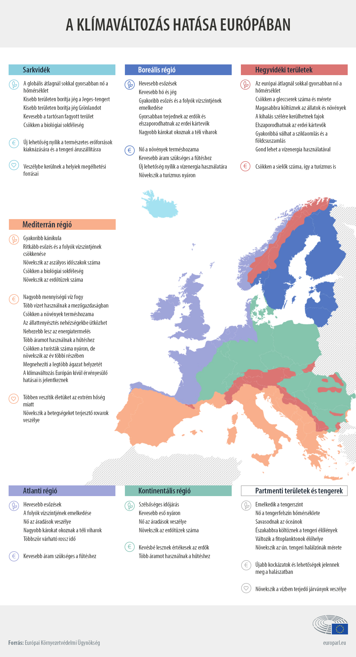 Egyre szélsőségesebbé fog válni az időjárás Európa kontinentális éghajlatú területein, növekedni fog a szárazság, és ezzel párhuzamosan az erdőtüzek veszélye is, de a hirtelen lehulló nagy csapadék is komoly problémákat okozhat – legalábbis ez olvasható ki az Európai Parlament által közzétett infografikán, mely a globális klímaváltozás várható hatásait veszi sorra régiónként.