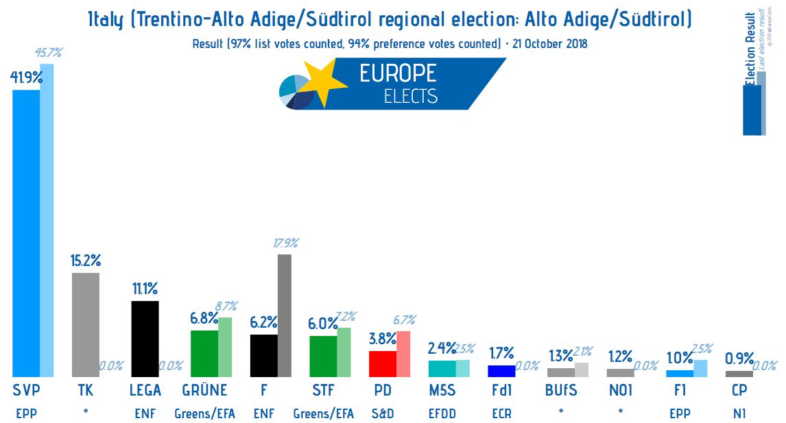 A bozeni (bolzanoi) parlamentből kiesett viszont Silvio Berlusconi Forza Italiája. Matteo Renzi Demokrata Pártja pedig csak egy mandátumot tudott hozni. Idén se ugorta meg a bejutási küszöböt a Dél-Tirolban felettébb hangos, de nem túl népszerű fasiszta Casa Pound párt. (További részletes eredmények itt olvashatóak.)