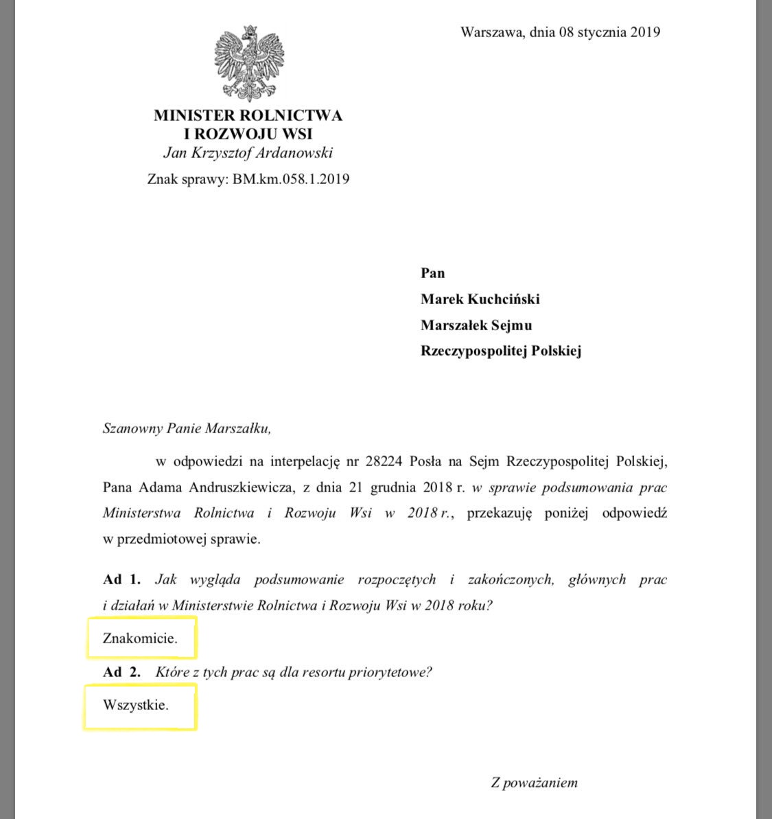 A Lengyel Köztársaság parlamentjének 28224. számú, Adam Andruszkiewicz úr által december 21-én benyújtott interpellációjára a Mezőgazdasági és Vidékfejlesztési minisztérium 2018-as munkájával kapcsolatban a következő választ adjuk.