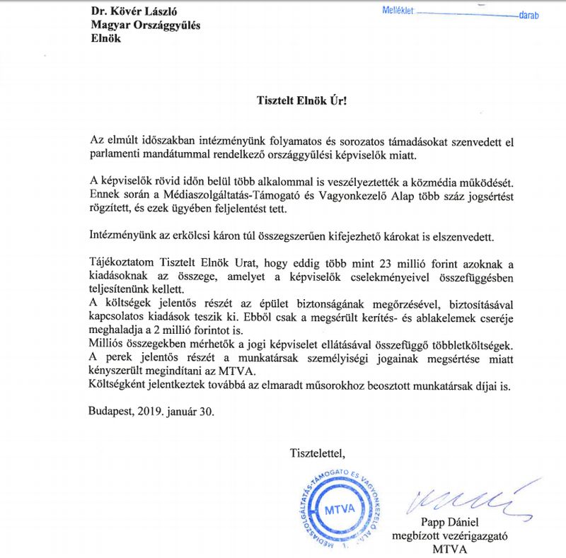 Az erkölcsi káron túl összegszerűen is kifejezhető károkat szenvedett el az MTVA, mivel ellenzéki képviselők bementek oda – írja Papp Dániel MTVA-vezér az Azonnali birtokába került, Kövér László házelnöknek címzett levelében, amelyet a házelnök információink szerint értesítés végett a parlamenti frakcióknak is kiküldött.