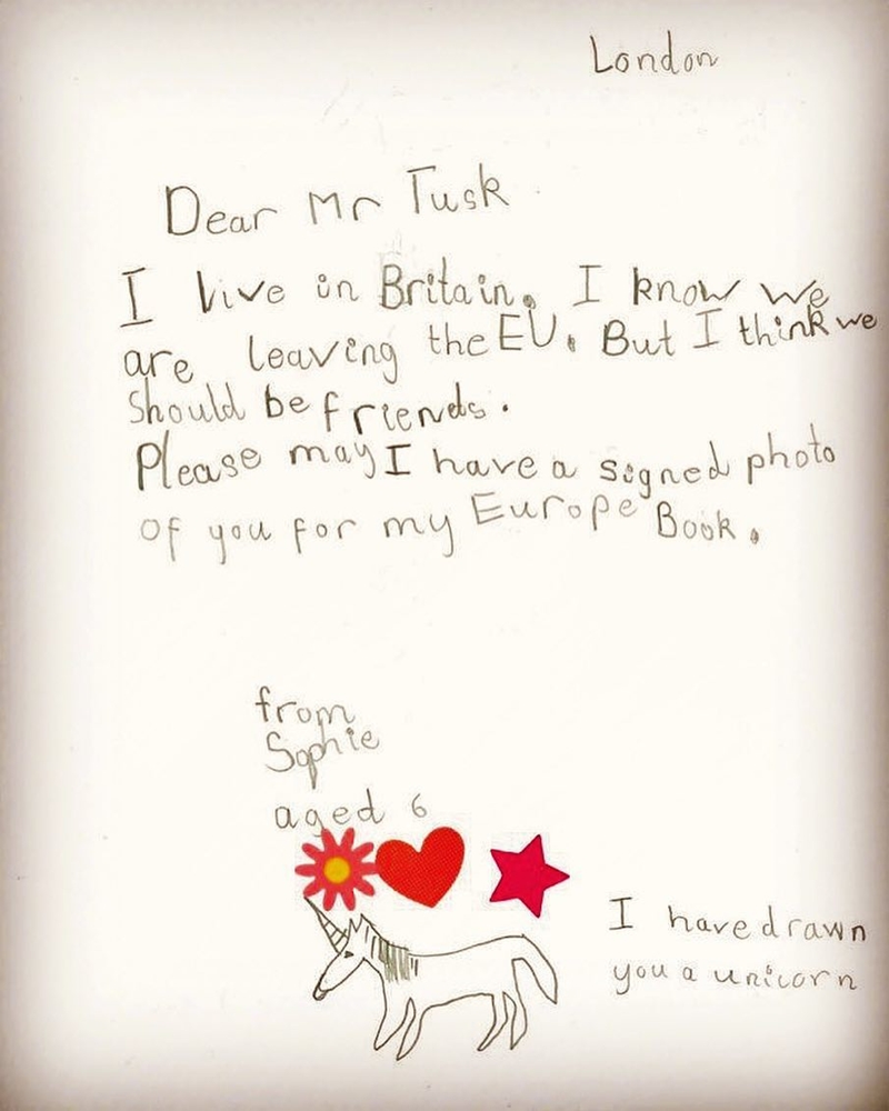 – kezdi Donald Tusknak, az Európai Tanács elnökének címzett levelét a 6 éves Sophie, amit a lengyel politikus osztott meg az Instagramon. A Londonban élő kislány egy szignózott portréképet kért Tusktól az „Európa-könyvébe”,