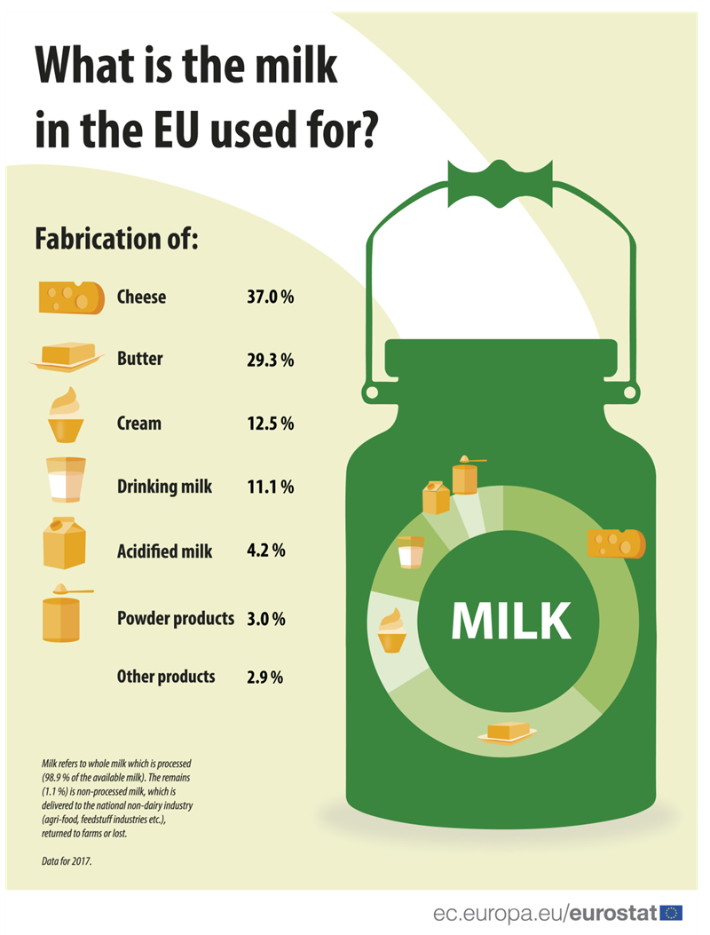 Ma hozta nyilvánosságra az Európai Unió statisztikai hivatala, az Eurostat a tagállamok 2017-es tejipari teljesítményét bemutató adatokat. Eszerint a tavalyit megelőző évben összesen 156,9 millió tonna – túlnyomó többségében tehén – tejet állítottak elő az Unió gazdaságai. Meglepő módon azonban ennek a mennyiségnek csak alig több mint tizede kerül reggeli italként a polcokra. Az előállított tej 37 százalékából sajt, 29,3 százalékából vaj lesz. De