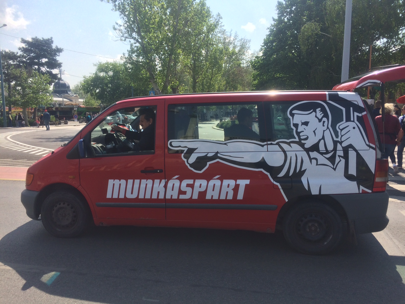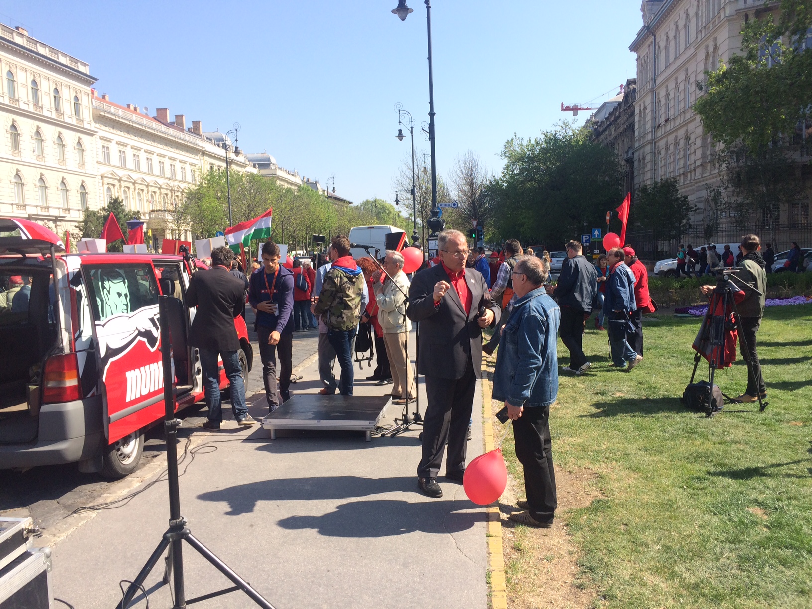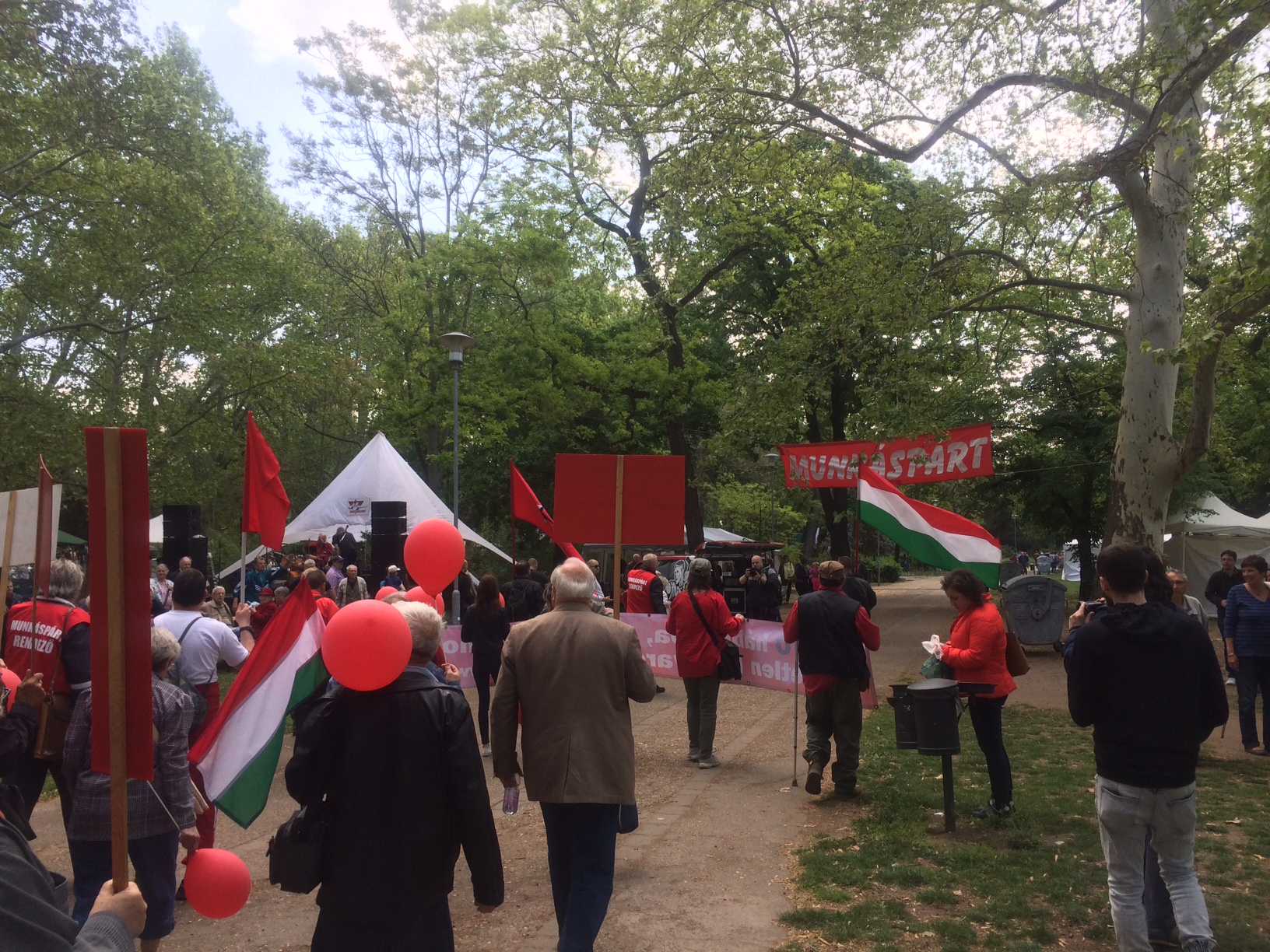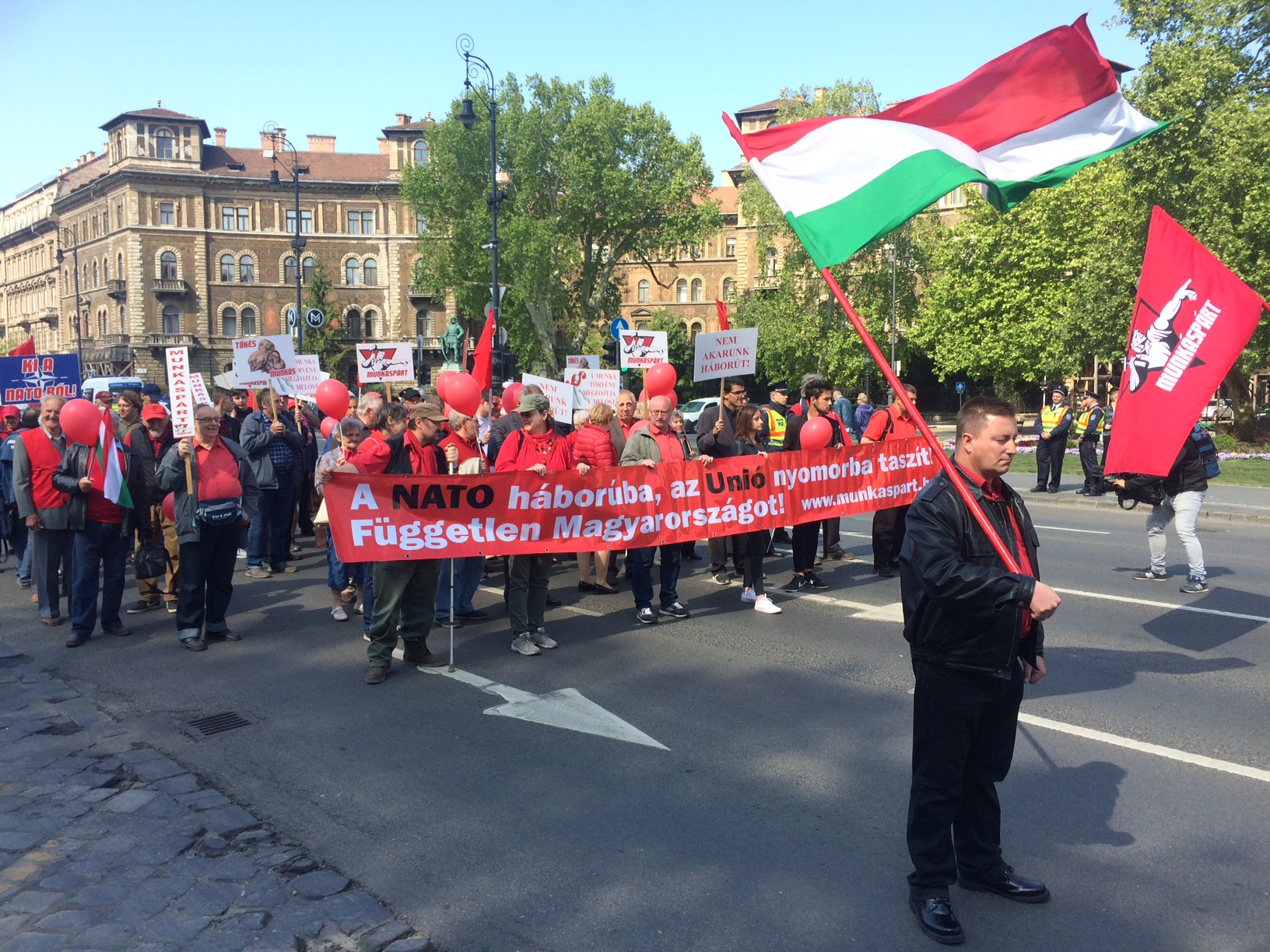 És még meg is indulhatott a menet a hangsúlyozottan nem tőkés Mercedes mögött, és ezzel átváltott a nagy felvonulás valami soha véget nem érő lassított filmbe. Az egy dolog, hogy a Kodály köröndtől amúgy sem olyan rövid idő eljutni a Városligetbe, de a Munkáspárt annyira vigyázott a még velünk lévő tagjai egészségére, hogy a hagyományosan lassú turistacsoportok is rendre beelőzték a munkásmenetet. Még csak a Bajza utcánál jártunk, amikor rájöttem, hogy ez az egész menet valójában jobban kizsigereli szegényeket, mint bármelyik nagytőkés: nem elég, hogy nem halad, de még a kiváló hangulatú munkásindulókat is megszakították a párt üzeneteivel.