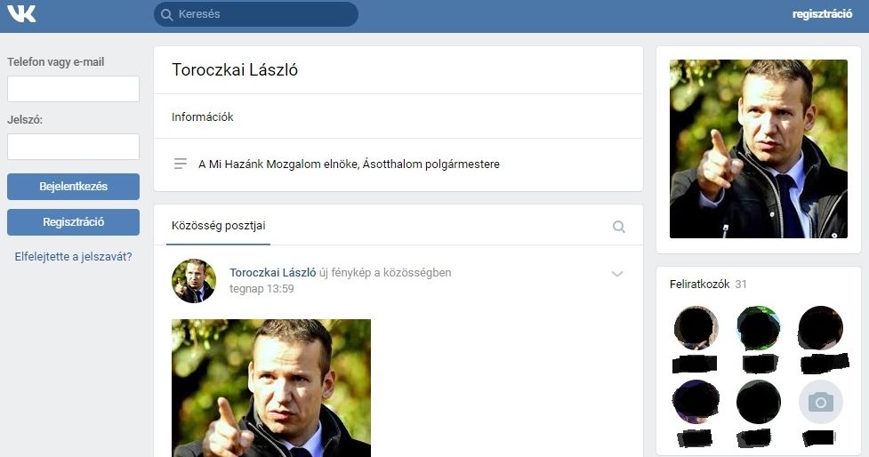 Miután letiltották 207 ezer követővel bíró Facebook-oldalát, regisztrált az orosz ellen-közösségi oldalra, a VKontakte-ra Toroczkai László, a Mi Hazánk Mozgalom elnöke – közölte a párt, egyébként éppen a Facebookon. A szélsőjobboldali politikus azt állítja, a Facebook indoklás nélkül tette elérhetetlenné közösségi oldalát.