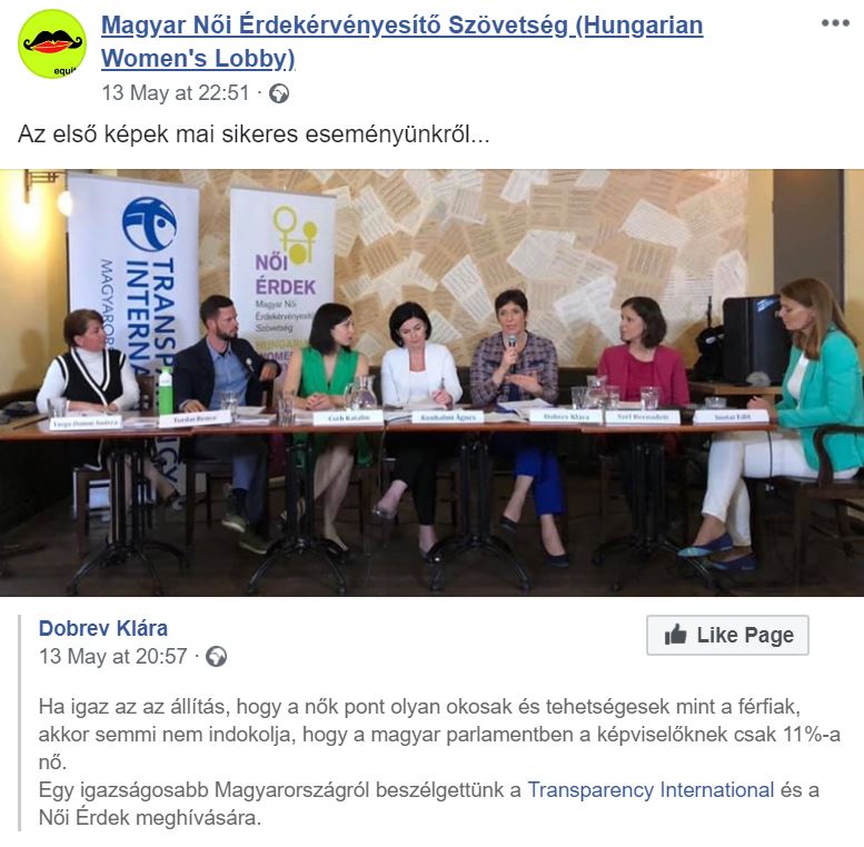 A fehér sapkás brandépítés persze nagy kudarc lett, de ez nem akadályozta meg a nőjogi NGO-kat tömörítő ernyőszervezetet, a Női Érdeket abban, hogy egy új projektjével alájátsszon az ellenzékinek nevezett pártok kampánystratégiájának. A „társadalmi nemek” és a korrupció összefüggéseit vizsgáló projekthez kapcsolódó nyilvános eseményen díszes kompániát rántottak össze Gyurcsánynétól a Jobbikos Varga-Damm Andreáig, és nem is rejtették különösebben véka alá, hogy az esemény tétje az idei európai parlamenti és önkormányzati választások.