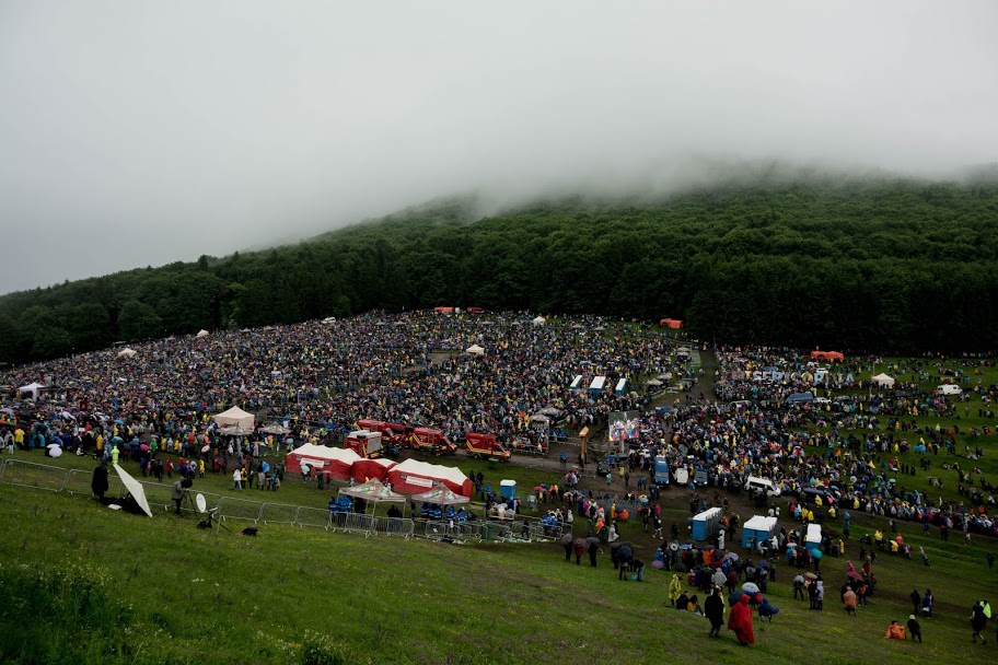 Aki türelmetlenebb, az a felvezető kavicsos utat elhagyva nekivág a mezőnek és lassan mindenki felér a Csíksomlyói hegy nyergébe. Itt derül ki, hogy fölösleges volt a szigorúnak bejelentett biztonsági ellenőrzés miatti aggodalom, már nem nézi senki a regisztrációs jegyeket. A szektorok nagyjából megteltek, és a csúszós terep az egyetlen akadály, nem a beengedőkapu. De akad olyan is, aki feladja. Fölfele menet egy román csoport jön szembe, ők már nem bírták tovább a szakadó esőt és a reggel héttől tartó vizes várakozásban teljesen átfagytak. „Köd van, alig lehet pár méterre látni” – mondják talán saját maguk igazolására is.