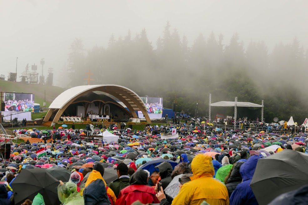 A borongós, ködpárás hegyen a pápára várva az jutott eszünkbe, hogy hányszor fantáziáltunk már arról, mint valami valószerűtlen és teljesen lehetetlen dologról, hogy milyen lenne az, ha egyszer maga a katolikus egyház feje lenne együtt velünk ezen hegyen. Ekkor a domb alján fekete autók fordulnak rá az útra és minden szem a kivetítőkre szegeződik. Hamar alábbhagy a lelkesedés: kiderül, hogy ez még nem az, amire lélegzetvisszafojtva várunk, ez „csak” Románia miniszterelnöke.