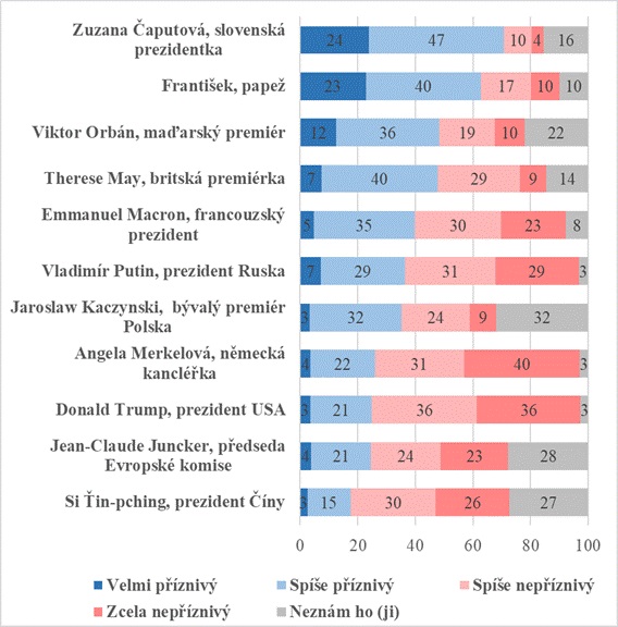 A júniusban készült felmérés szerint a legnépszerűbb Zuzana Čaputová újonnan beiktatott liberális szlovák államfő lett, akiről a csehek 24 százalékának teljesen, 47 százalékuknak pedig inkább pozitív a véleménye, a szlovák elnököt összesen csak 14 százalék nem kedveli. Ezzel Čaputová még Ferenc pápát is megelőzte, akit 23 százalék teljesen, további 40 pedig részben szeretett. Viszont Ferenc pápa ellenzőket is gyűjtött bőven a csehek körében: 17 százalék inkább negatívan, míg további 10 nagyon negatívan vélekedik a katolikus egyházfőről.
