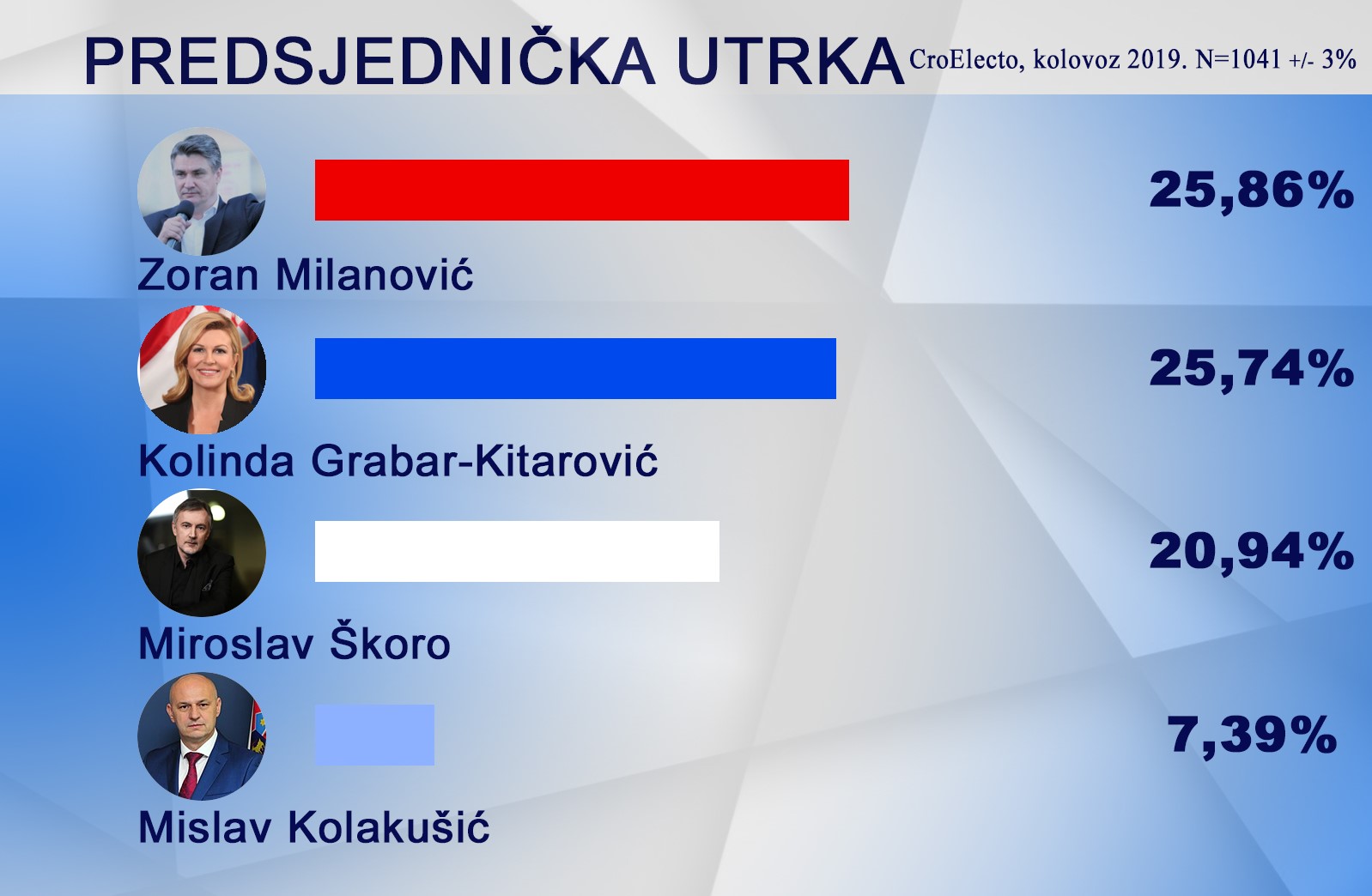 Persze nagyon szűkek a különbségek: Milanović és Grabar-Kitarović között hibahatáron belüli. De Miroslav Škoro ott lohol a nyomukban húsz százalékkal.