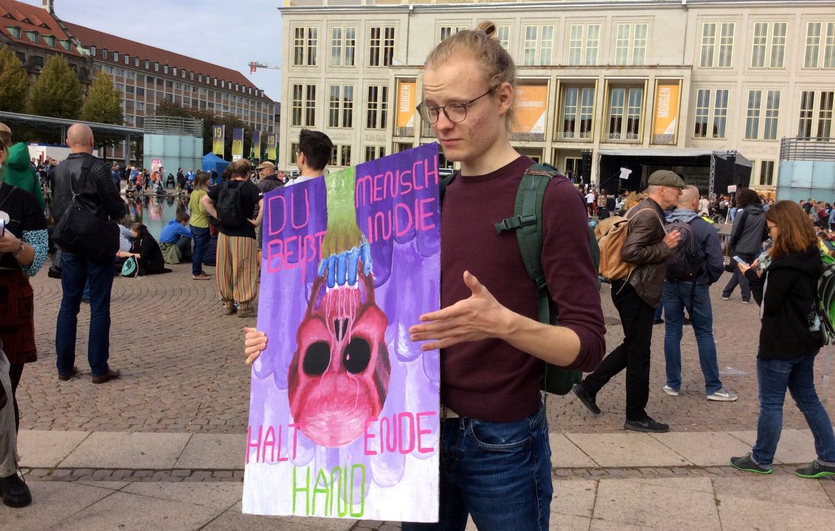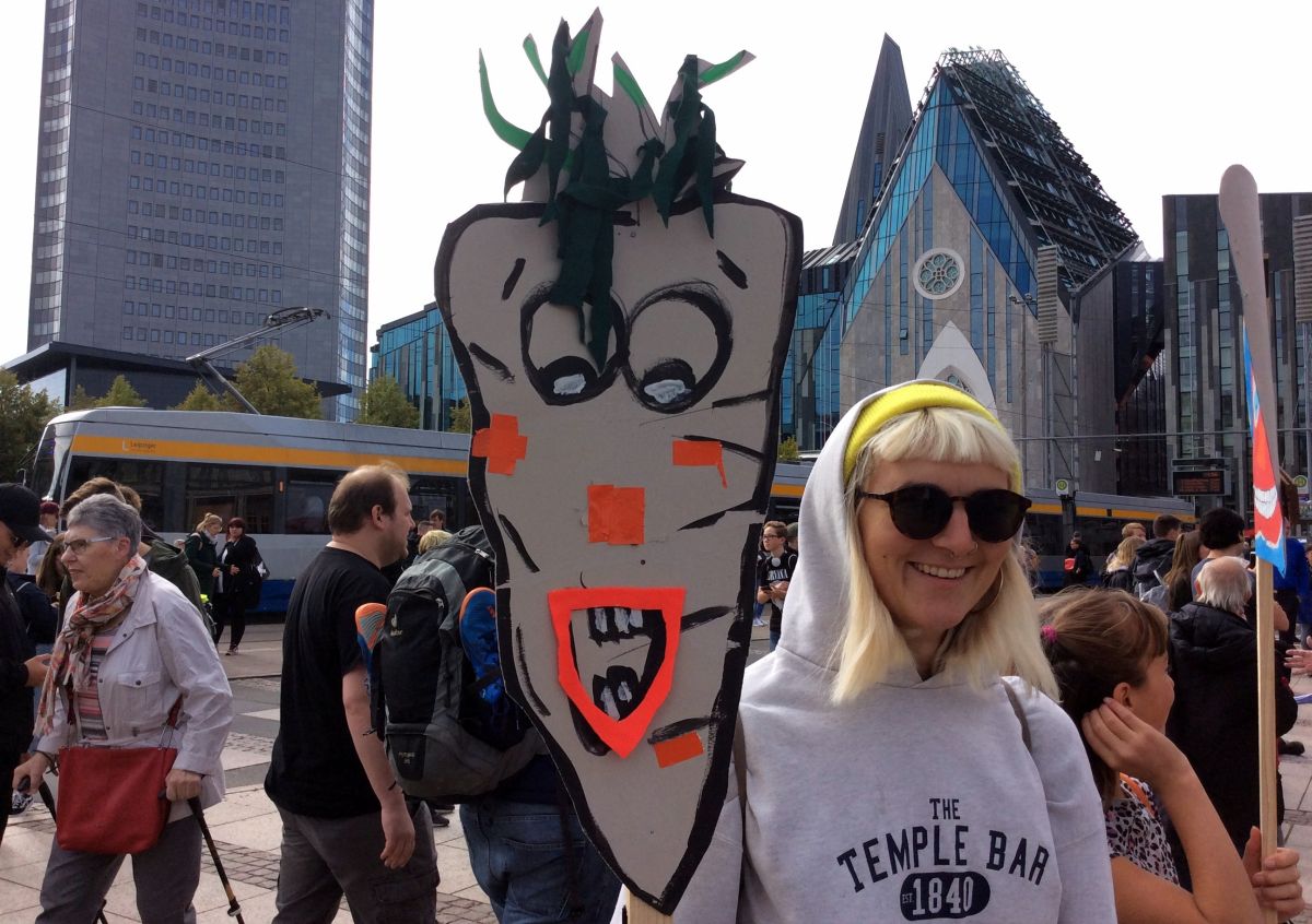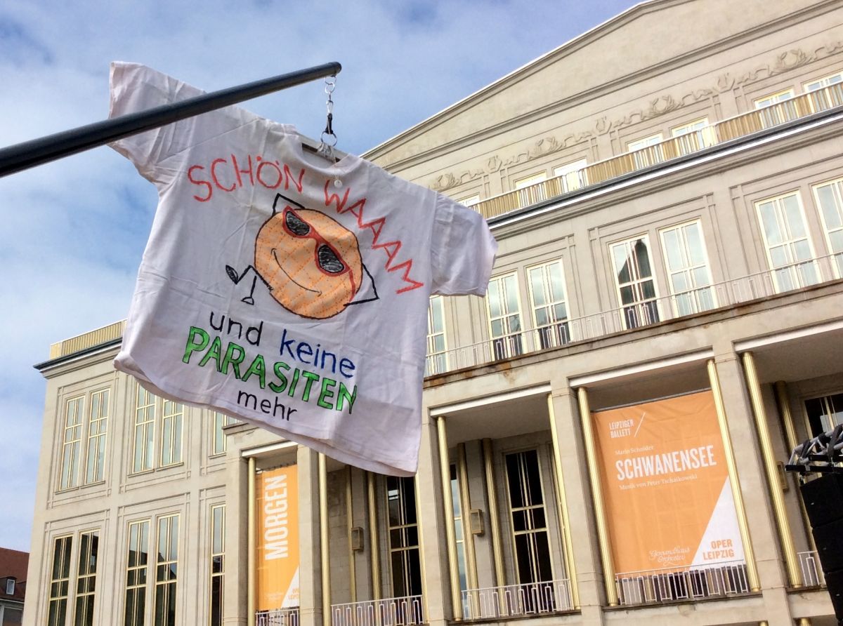 „JÓ MELEG VAN, NINCSENEK MÁR PARAZITÁK” – KÉPZELI MAGÁT A FELFORRÓSODOTT FÖLD HELYÉBE A TRANSZPARENS MÁR LIPCSÉBEN. A SZÁSZ NAGYVÁROSBAN DÉLUTÁN HÁROMKOR KEZDŐDÖTT A BULI, EZT A TÜNTETÉST NAPOKKAL ELŐTTE MÁR FIZETETT ÚJSÁGHIRDETÉSEKBEN ÉS RENGETEG PLAKÁTON REKLÁMOZTÁK, MÉG AZ MDR KÖZTÉVÉ SZERKESZTŐSÉGÉBEN IS VOLT EGY PLAKÁT ARRÓL, HOGY LESZ EZ A DEMONSTRÁCIÓ.