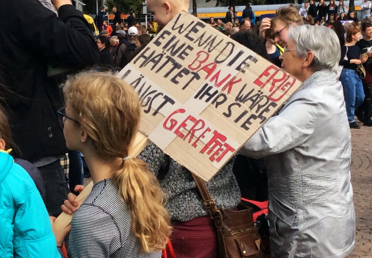 HA A FÖLD EGY BANK LENNE, MÁR RÉG MEGMENTETTÉTEK VOLNA, ÜZENI EZ AZ ISKOLÁS KISLÁNY A TRANSZPARENSÉN A POLITIKUSOKNAK.