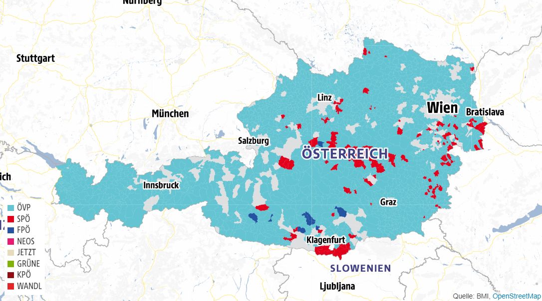 Kurz Néppártjának türkizkékje, amely Tirolban és Felső-Ausztriában nyert a legnagyobbakat. Az SPÖ szinte csak nagyvárosokban tudott nyerni, de jól szerepelt a rendpárti SPÖ-s tartományi miniszterelnök, Hans-Peter Doskozil vezette Burgenlandban is. Az FPÖ Karintiában, Stájerországban és Felső-Ausztriában maradt erős. A liberális NEOS Vorarlbergben szerepelt az országos eredményen jelentősen felül.
