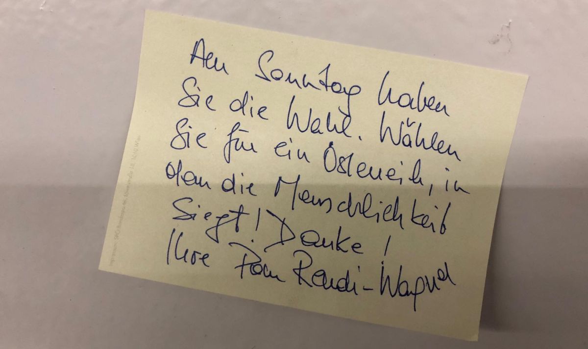 A Mariahilfer Straße Westbahnhof felőli végénél lévő Zieglergasse metrómegállót ellepték a postitek, amiken Pamela Rendi-Wagner, a szociáldemokraták kancellárjelöltje arra kérleli a cetliket elolvasókat, hogy az emberség győzelme érdekében szavazzanak.