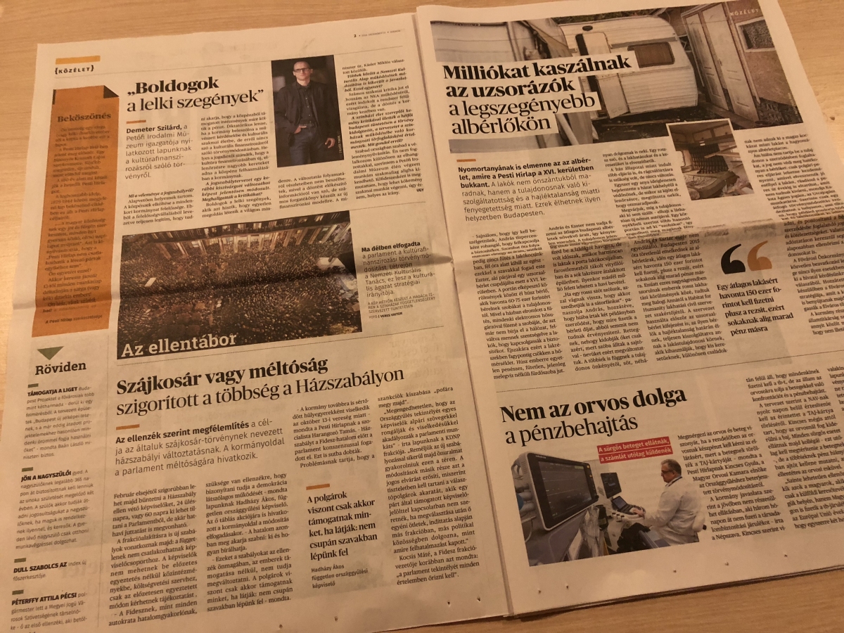 A Pesti Hírlapnál az Élet uzsoraalbérletben című anyag szerepel a legnagyobban, ez a lakhatási válságról szól, alatta felteszik a kérdést, hogy mit nyerhetnek a budapestiek az atlétikai stadionnal. Szerepel még rajta Pokorni Zoltán XII. kerületi fideszes polgármester, az elfogadott parlamenti kultúratörvény, a Petőfi Irodalmi Múzeumot igazgató Demeter Szilárd, a magyar és osztrák foci pénzügyi hátterét összehasonlító cím, és Se kenyér, se cirkusz címmel az, hogy Oroszországot minden nagyobb világversenyről kitiltották.