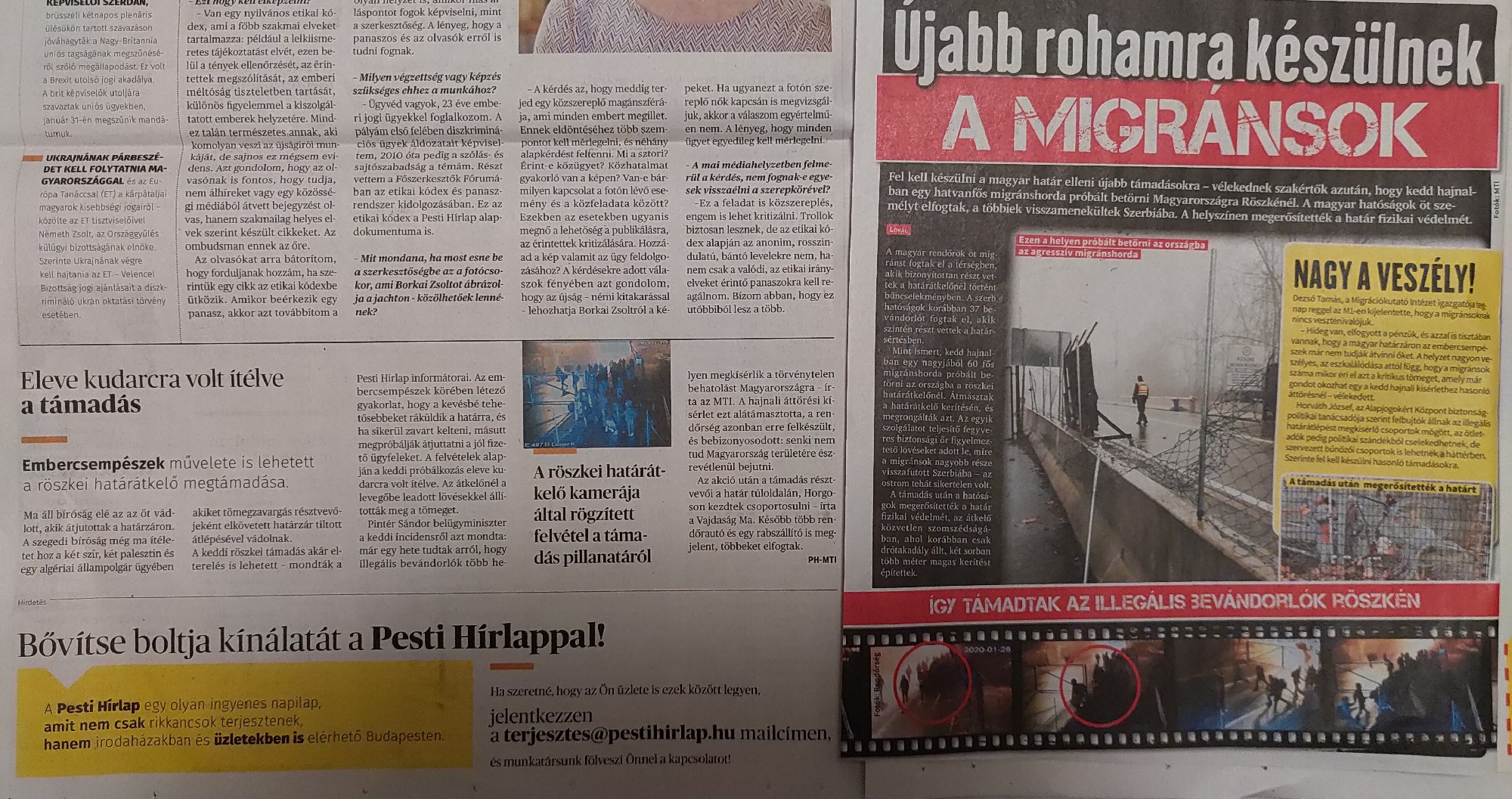 A Pesti Hírlapban a migránsoknak a röszkei határkerítés elleni támadásáról a negyedik oldalon számol be, mellette a kispesti szocialisták korrupciós botrányairól is szó esik. Ezen felül a lapban elfért még egy szocioriport is, ahol egy budapesti pár menekülését mutatták be egy XVI. kerületi uzsoraalbérletből (hasonló témában egyébként már a lap próbaszámában is volt cikk).