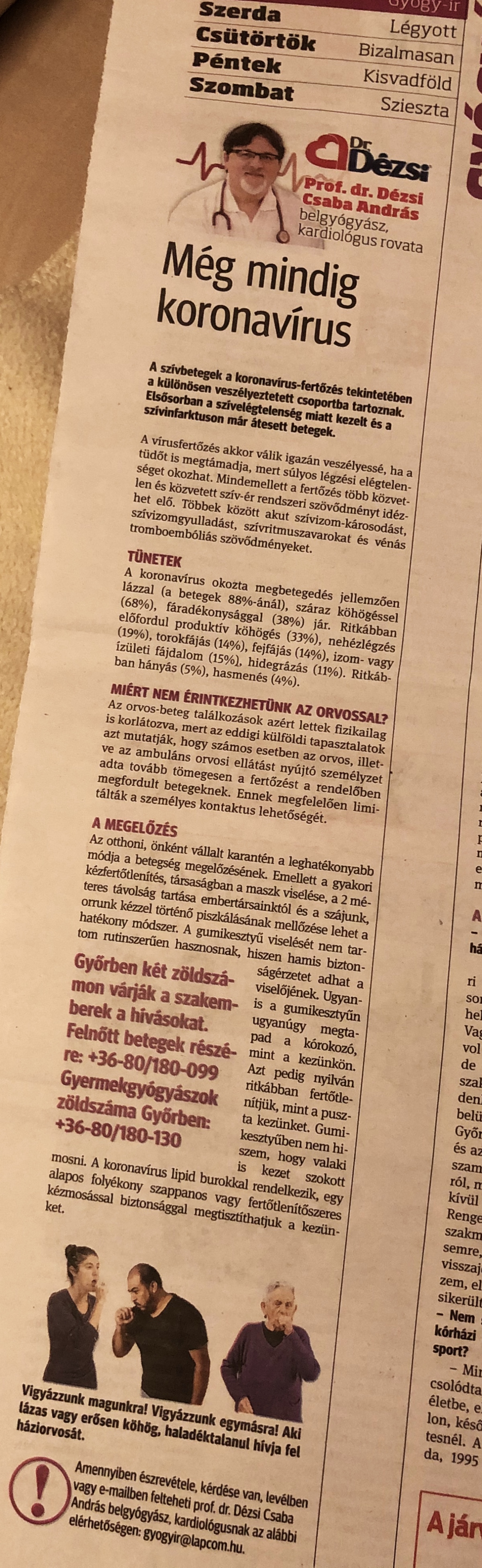 Apró érdekesség, hogy a győri polgármesternek továbbra is él az orvosi tanácsadói rovata a Győr-Moson-Sopron megyei napilapban, a Kisalföldben, ahol kedden pont a koronavírus volt írásának témája: