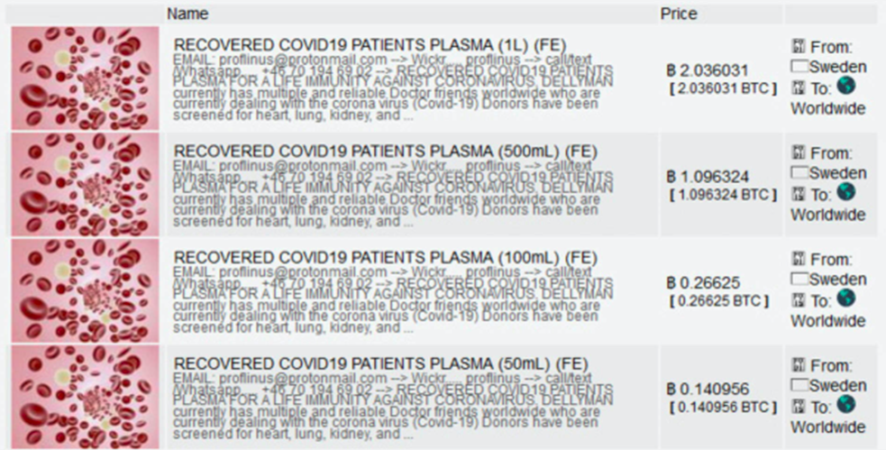 Egy hirdető például gyógyult koronavírusos betegek vérplazmáját árulja elég borsos áron: ötven milliliter négyszázezer forintnyi, egy liter pedig öt és fél millió forintnyi kriptovalutáért vásárolható meg. A hirdetés élethosszig tartó immunitást ígér a vírus ellen, ami jelenlegi ismereteink birtokában nem is lehetséges, a szakértők egyelőre legfeljebb néhány hónapos immunitásról beszélnek, illetve az sem derül ki a hirdetésből, hogy mit is kéne tennünk a vérplazmával a megvásárlása után. Arról nem is beszélve, hogy nem igazán ajánlott a dark weben vásárolt vért bevinnünk a szervezetünkbe, már ha egyáltalán valóban vért kapunk.