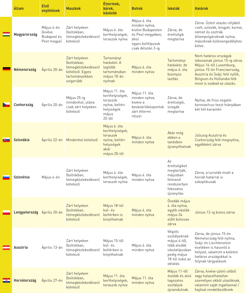 A szlovák külügy mini-Schengent építene a csehekkel és osztrákokkal, a csehek nem hosszabbítják meg a rendkívüli állapotot, Lengyelország a fertőzött bányászok miatt akár le is zárhatja Sziléziát, Németországban minden tartomány a maga útját járja, a horvátoknál pedig elindult a légi közlekedés az országon belül. Lazításkörkép Európából!