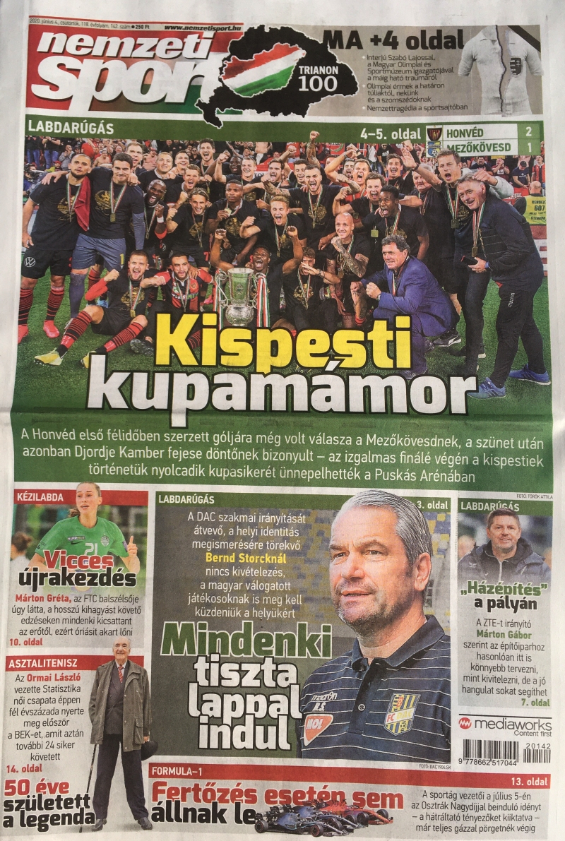 KEZDJÜK RÖGTÖN A MINISZTERELNÖK KEDVENC NAPILAPJÁVAL: NOHA A VEZETŐ ANYAGNAK SEMMI KÖZE A SZÁZADIK ÉVFORDULÓHOZ, A NEMZETI SPORTNÁL PLUSZ NÉGY OLDALON JÁRJÁK KÖRBE, MI KÖZE VAN A BÉKESZERZŐDÉSNEK A HAZAI SPORTHOZ.