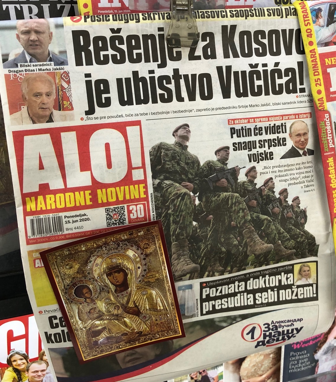 A NÉMET TULAJDONBAN LÉVŐ, SZINTÉN A HALADÓ PÁRTOT TÁMOGATÓ ALO! BULVÁRLAP FŐ SZTORIJA AZ, HOGY AZ ITTENI FŐ ELLENZÉKI MUMUS, ĐILAS EGYIK MUNKATÁRSA ÁLLÍTÓLAG ARRÓL BESZÉLT, HOGY CSAK AKKOR LESZ MEGOLDÁS KOSZOVÓ ÜGYÉBEN, HA MEGÖLIK VUČIĆOT. LEGALÁBB ENNYIRE FONTOS HÍRKÉNT TÁLALJÁK, HOGY OKTÓBERBEN RENDEZIK A SZERB HADSEREG VALAHA VOLT LEGNAGYOBB FELVONULÁSÁT, AMIT BIZONY VLAGYIMIR PUTYIN OROSZ ELNÖK IS MEGTEKINT MAJD. GRÁTISZ A LAP MELLÉ: AJÁNDÉK SZENTKÉP!