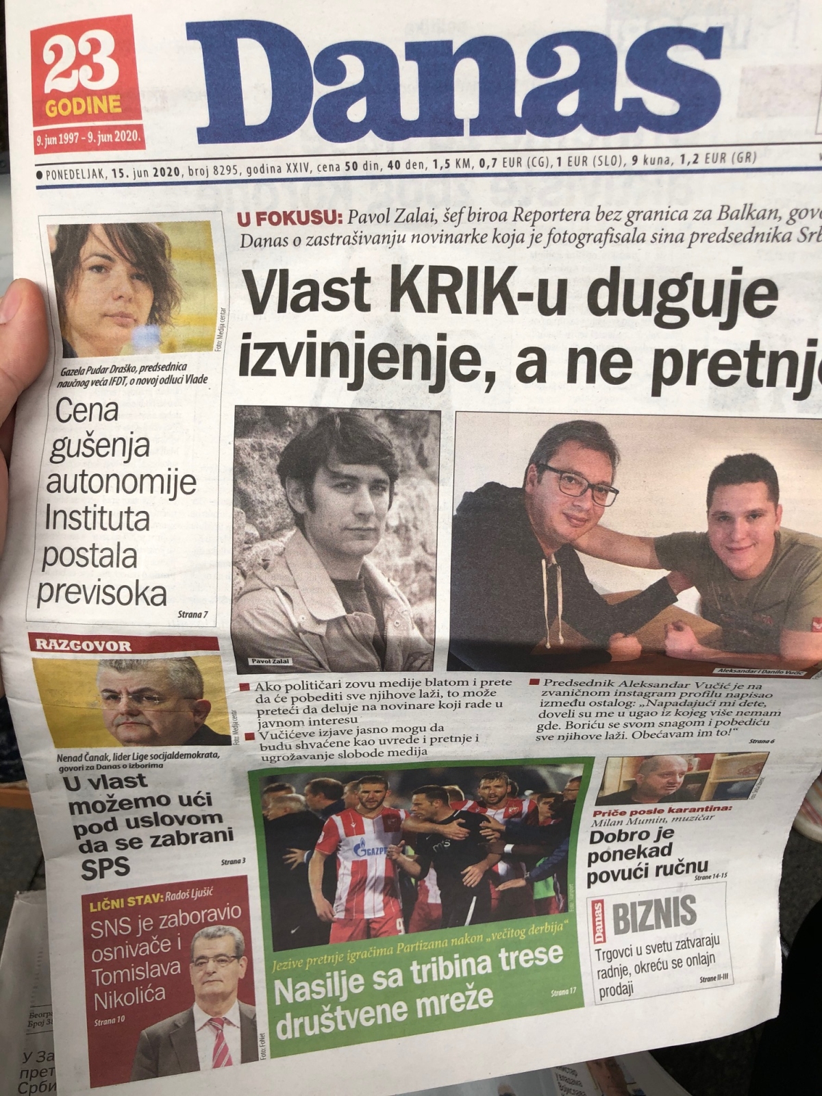 AZ EGYETLEN ELLENZÉKI NAPILAP, A BALKÖZÉP DANAS CÍMLAPJÁN A VEZETŐ SZTORI AZ, AHOGY A RIPORTEREK HATÁROK NÉLKÜL BALKÁNI IRODÁJÁNAK VEZETŐJE ELMONDTA, HOGYAN PRÓBÁLTÁK MEGFÉLEMLÍTENI AZT AZ ÚJSÁGÍRÓT, AKI LEFOTÓZTA A SZERB ELNÖK FIÁT. VAN INTERJÚ EGY VAJDASÁGI SZOCDEM PÁRT ELNÖKÉVEL, AKI SZERINT AKKOR JUTNAK CSAK HATALOMRA, HA A SZERB HALADÓ PÁRTOT BETILTJÁK, ILLETVE EGY TÖRTÉNÉSSZEL, AKI SZERINT A HALADÓ PÁRT ELFELEJTETTE ALAPÍTÓIT ÉS KORÁBBI ÉRTÉKEIT.