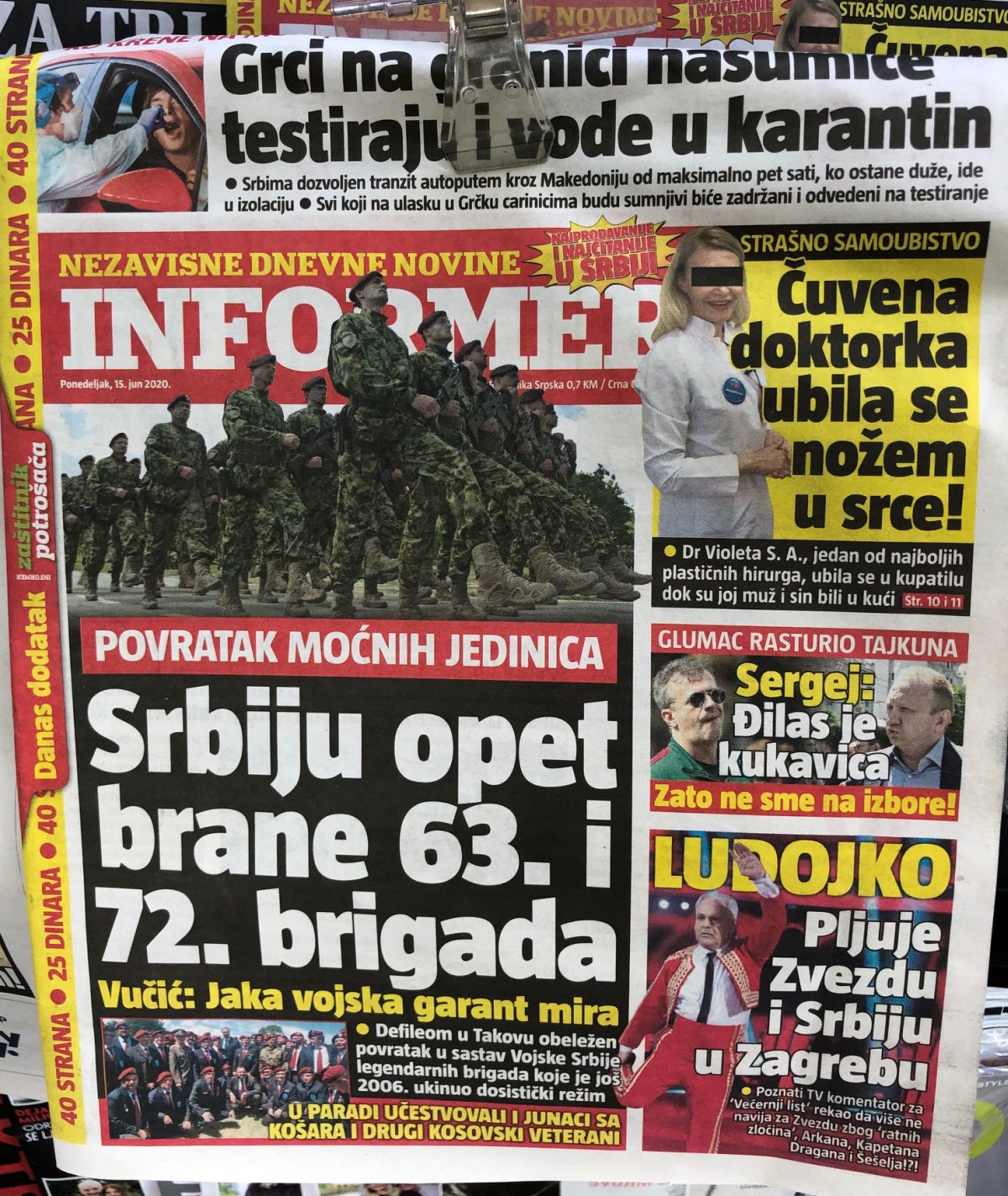 SZERBIA LEGNAGYOBB PÉLDÁNYSZÁMBAN ELADOTT NAPILAPJA A KORMÁNYPÁRTOT TÁMOGATÓ INFORMER. A CÍMLAPSZTORI AZ, HOGY AZ ELNÖK SZERINT AZ ERŐS HADSEREG A BÉKE GARANCIÁJA, DE ELFÉRT RAJTA EGY KIS SZOKÁSOS HECCELÉS A HORVÁTOK ELLEN, VALAMINT AZ IS, HOGY A VASÁRNAPI VÁLASZTÁST NEM BOJKOTTÁLÓ EU-PÁRTI ELLENZÉKI LIBERÁLIS PÁRT SZÍNÉSZ ELNÖKE BESZÓLT A BOJKOTTPÁRTI ERŐS EMBERNEK, A HELYI DEMSZKYBE OLTOTT GYURCSÁNYKÉNT JELLEMEZHETŐ ĐILASNAK, HOGY GYÁVA.