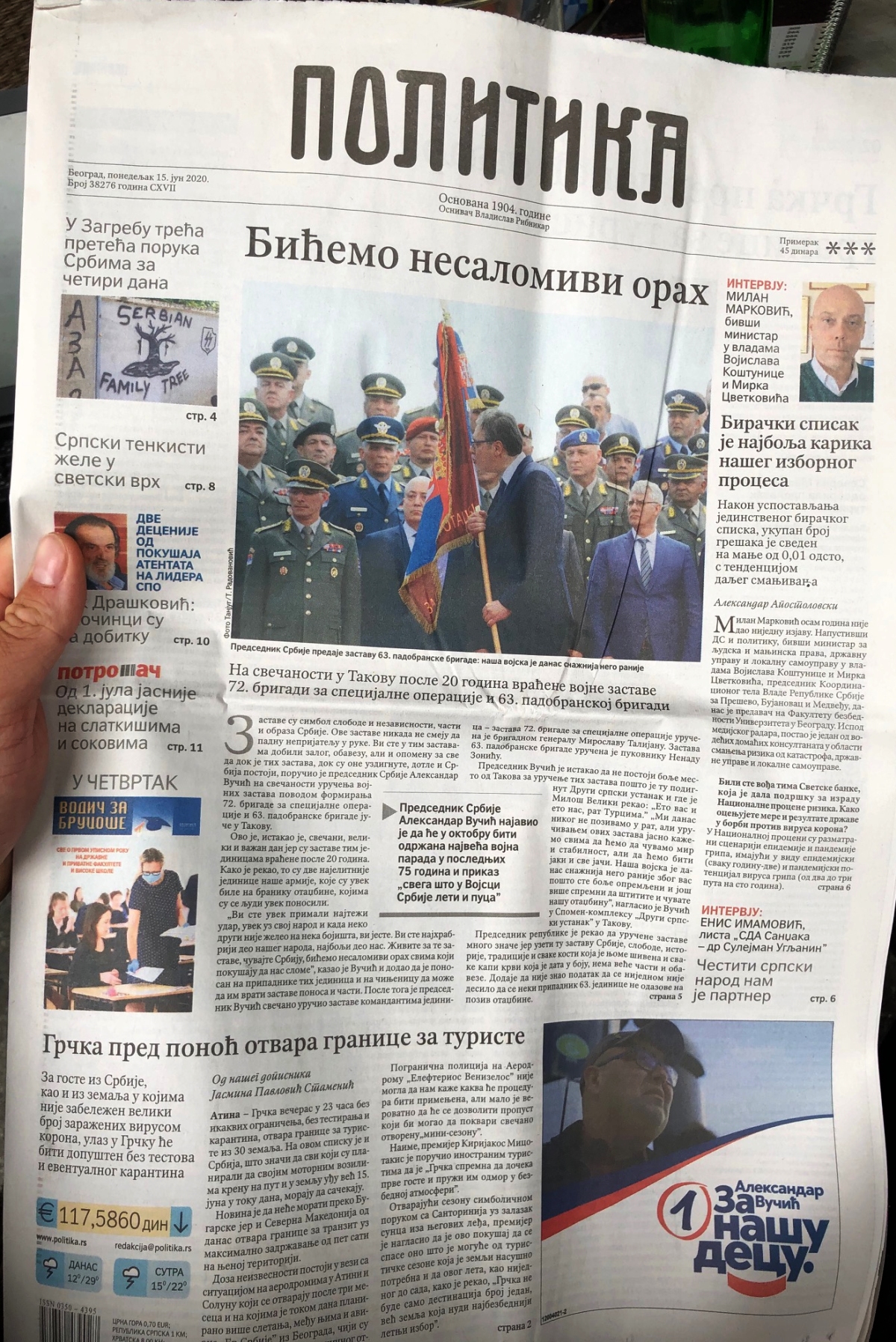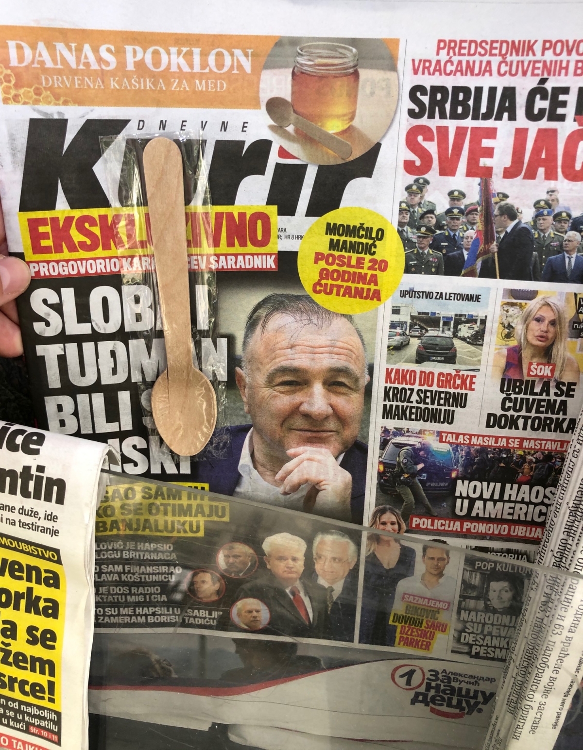 A SZINTÉN A KORMÁNYPÁRTHOZ HÚZÓ KURIR FŐ SZTORIKÉNT MÉG MINDIG EGY DÉLSZLÁV HÁBORÚ IDEJÉBŐL SZÁRMAZÓ LELEPLEZÉST TÁLAL. A CÍMLAP ALJÁRA JUTOTT EGY HIRDETÉS AZ ELNÖK PÁRTJÁTÓL, A TETEJÉRE PEDIG EGY SZÍVÉLYES FOTÓ ARRÓL, AHOGYAN A HADSEREGGEL PARÁDÉZÓ SZERB ELNÖK MEGCSÓKOLJA SZERBIA ZÁSZLAJÁT.