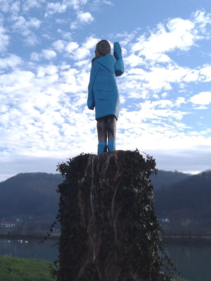 Az egykori Jugoszláviában született Melania Trump 2019 júliusában kapott életnagyságú fából készült szobrot a kelet-szlovéniai Sevnica mellett. Azt véletlenül sem lehet állítani, hogy Downey élethűen próbálta meg ábrázolni a first ladyt, akit leginkább arról a kék kabátról lehet felismerni, amelyet férje elnöki beiktatásán viselt.