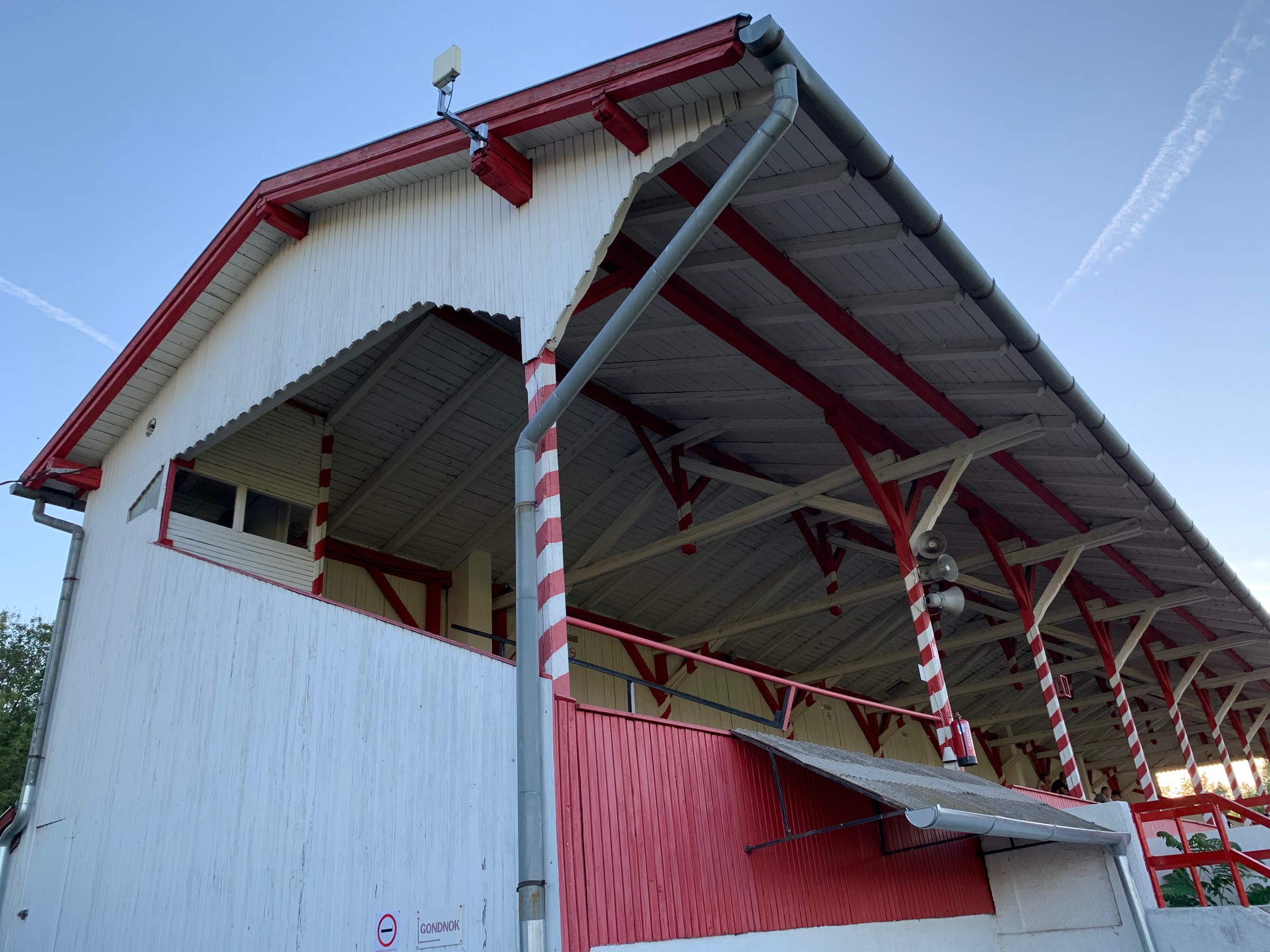 A környékről beszűrődő Family Frost-hang kicsit elterelte a figyelmemet a velünk élő pesterzsébeti futballtörténelemről, de a stadion történetére már rá tudtam csatlakozni: a főlelátó már az 1912-es átadás óta szinte teljesen változatlan, és azért ez a több, mint száz év hagyományosan nem tesz jót a fának, ezért a nagyobb kánikulákban locsolni kell. Van neki egy testvére is Erdélyben, eredetileg Kolozsvár mellett építették, majd amikor ott újat építettek, az elemeit átvitték Aranyosgyéresre, hogy azóta is ott szolgálja a közt.