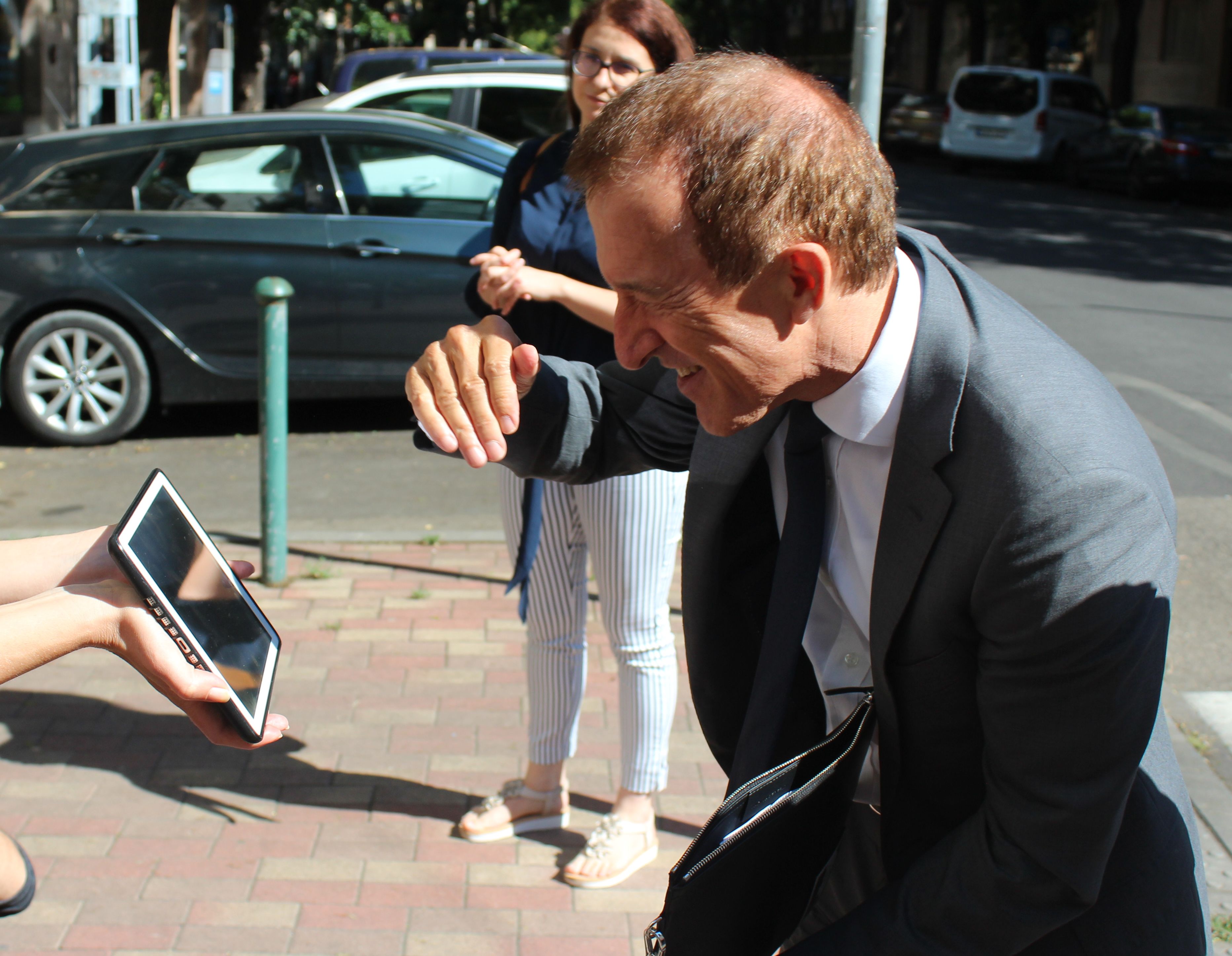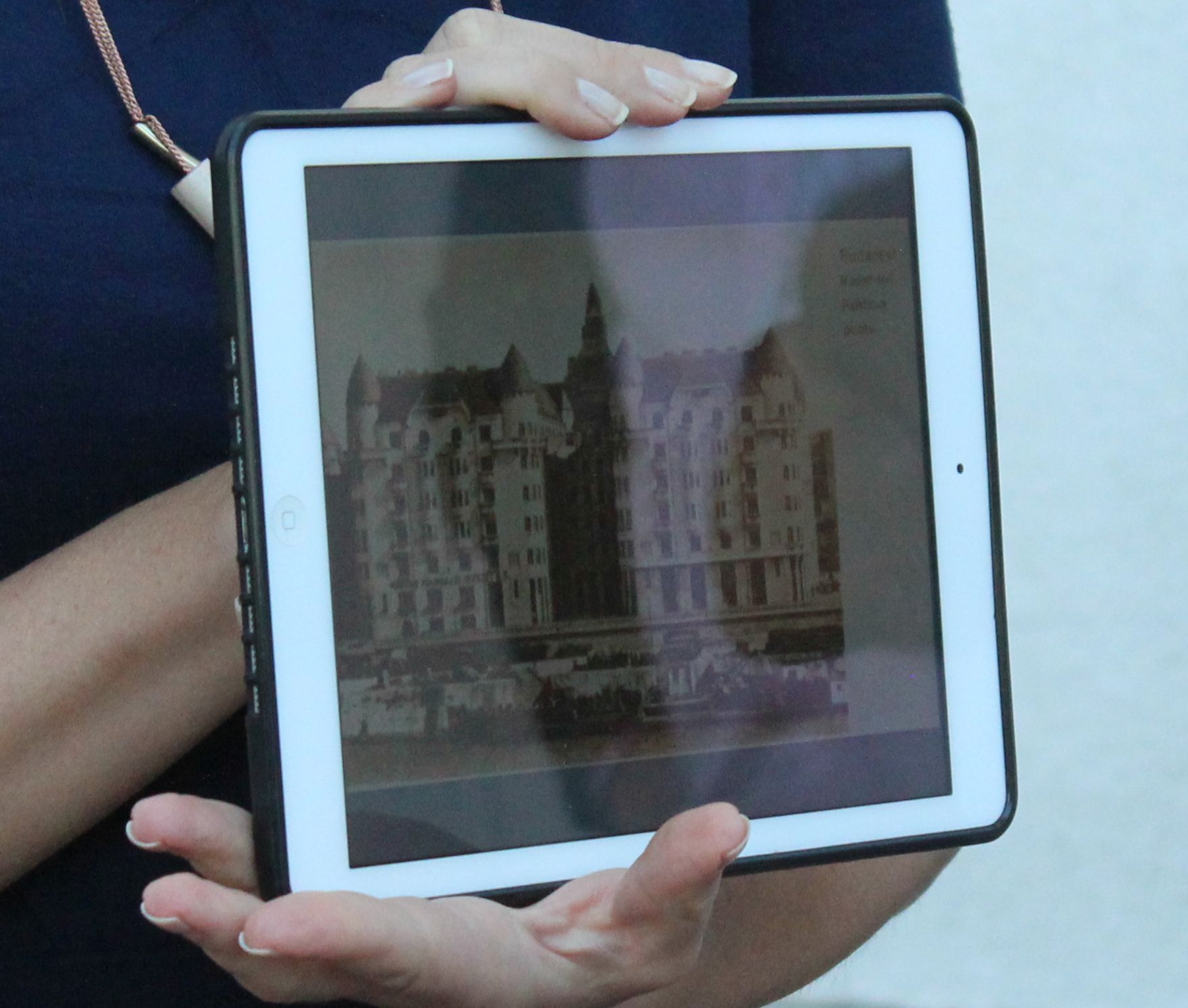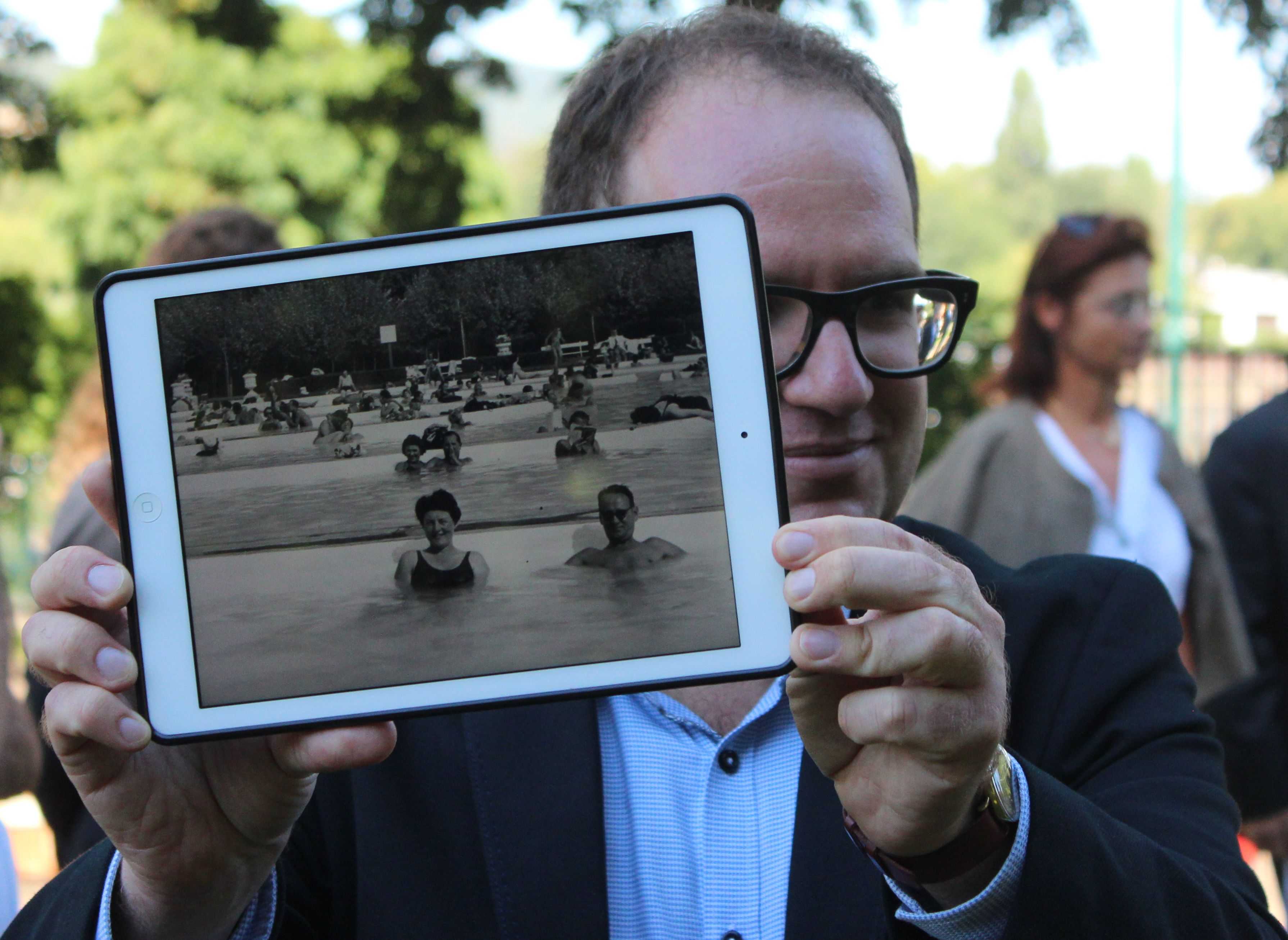 PETER BURKHARD, SVÁJC MAYGARORSZÁGI NAGYKÖVETE ÉPPEN AZ EGYIK VÉDETT HÁZ KORABELI FOTÓJÁT NÉZI. A SÉTÁT A SVÁJCI NAGYKÖVETSÉG FINANSZÍROZTA.