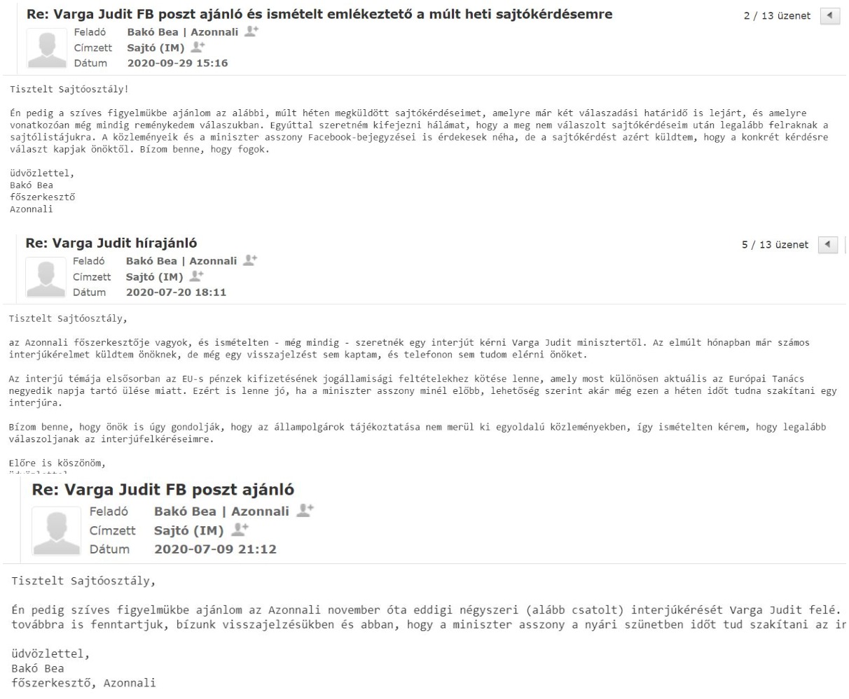 Azóta a minisztérium csak közvetett módon tudatta velünk, hogy tisztában van a létezésünkkel. Akár videós riportra, akár nagyinterjúra kértünk volna fel Varga Judit minisztert, akár csak egy konkrét szakpolitikai témában tettünk fel rövid kérdéseket, válasz sosem érkezett, azonban egyszer csak váratlanul felraktak bennünket a minisztériumi sajtólistára, hogy aztán naponta több, Varga Juditról szóló MTI-hírről és a miniszter Facebook-posztjairól is külön e-mailekben értesülhessünk.