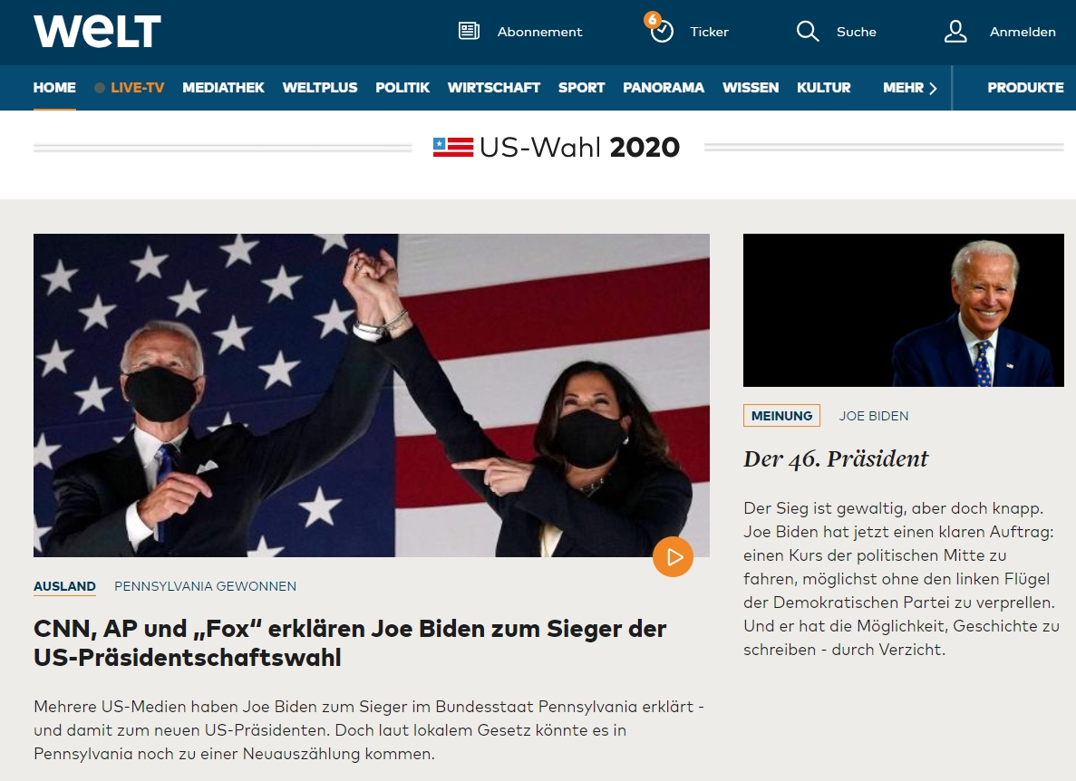 A NEOLIBERÁLIS DIE WELT BESZÁMOL ARRÓL, HOGY A FONTOSABB AMERIKAI MÉDIUMOK BIDEN GYŐZELMÉRŐL SZÁMOLNAK BE, MAJD EGY VÉLEMÉNYCIKKBEN KÜLÖN KÖSZÖNTIK AZ USA 46. ELNÖKÉT, AKITŐL AZT VÁRJÁK, HOGY KÖZÉPEN MARADVA TÖRTÉNELMET ÍRJON.