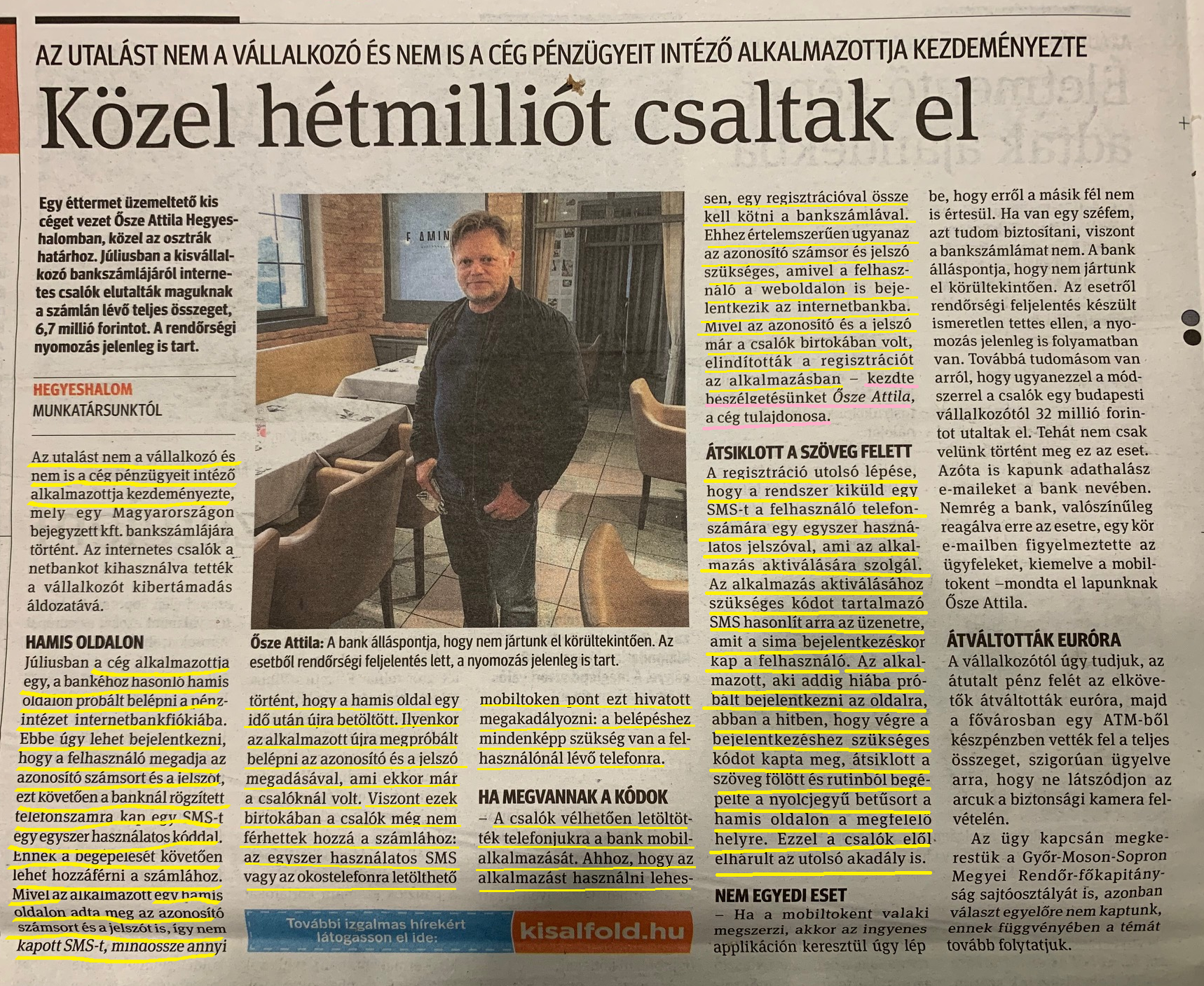 Szeptember 23-án megjelent egy riportom az Azonnalin: egy vállalkozó, Attila történetét dolgoztam fel benne, aki internetes banki csalás áldozata lett, és elveszített több mint hatmillió forintot. A riportot elég sokan olvasták – sajnos az ilyen jellegű csalások nem ritkák Magyarországon –, a megjelenése után más károsultak is jelentkeztek nálunk. Bár az áldozatokat egyelőre nem kártalanította a bank, azt jó volt látni, hogy – talán az én cikkem hatására is – a pénzintézet módosított a mobilalkalmazásába való bejelentkezés azon lépcsőfokán, amit kihasználva a csalók hozzáférhettek az áldozatok bankszámláihoz.