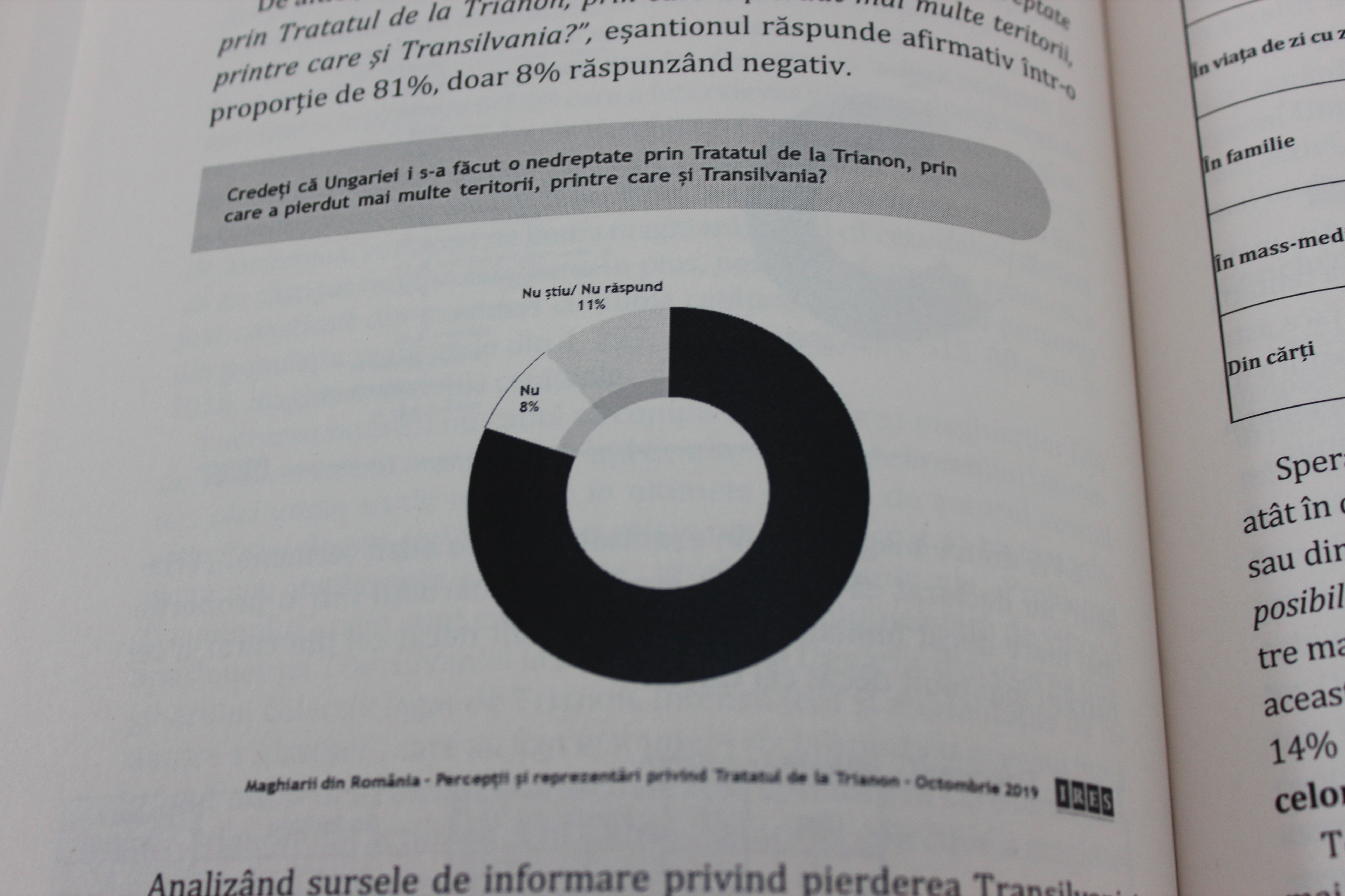 Szintén ebben a fejezetben ismerteti Dâncu az erdélyi magyarok – de inkább csak a székelyföldiek – között végzett közvélemény-kutatás eredményét. A közvélemény-kutatást a bukaresti egyetem szociológia tanszéke rendelte meg, elkészítését pedig az IRES közvélemény-kutató cég végezte el. A kutatás során magyar kérdőbiztosok telefonon 659 Hargita és Kovászna megyei magyart kérdezték meg. Törekedtek a reprezentativitásra is, mivel véletlenszerűen válaszották ki az alanyokat, így a válaszadók több társadalmi kategóriából jönnek, eltérő a végzettségük, generációs különbségek is vannak köztük. A közvélemény-kutatás hibahatára elég magas, 3,8 százalékos a módszertani leírás szerint. Eszerint