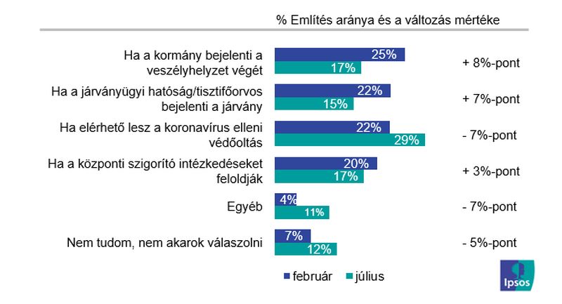 „Nagy többség a kormány és/vagy a járványügyi hatóság bejelentése után tekintené lezártnak a járványt (25 százalék és 22 százalék), míg további 17 százalék a szigorító intézkedések feloldásával érezné megoldottnak a krízishelyzetet” – írja elemzésében az Ipsos.