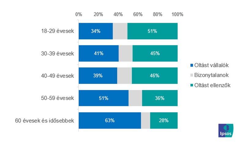 Az Ipsos azt is megállapítja, hogy az idősebbeket nagyobb arányban nyugtatja meg a vakcinák hazai megjelenése, míg a fiatalabbak inkább a korlátozó intézkedések feloldásához kötik a járványhelyzet végét.