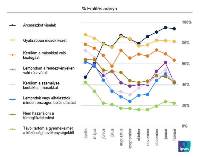 Amiben viszont egyértelműen lazult a fegyelem, az az embertársainkkal való találkozások mértéke: míg januárban még a rendezvényeken való részvételt a megkérdezettek több, mint 60 százaléka mondta le, a másokkal való személyes kontaktust közel 60 százalék kerülte, és az országon belüli utazásokat az emberek fele mondta le vagy halasztotta el, addig ez az arány mindegyik említett kategóriában 40 százalék körülre zuhant vissza.