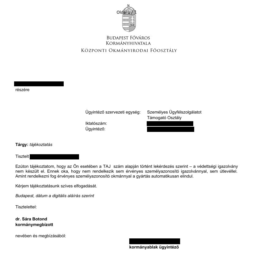 „Ezúton tájékoztatom, hogy az Ön esetében a TAJ szám lekérdezés szerint a védettségi igazolvány nem készült el. Ennek oka, hogy nem rendelkezik sem érvényes személyazonosító igazolvánnyal, sem útlevéllel. Amint rendelkezni fog érvényes személyazonosító okmánnyal, a gyártás automatikusan elindul.”