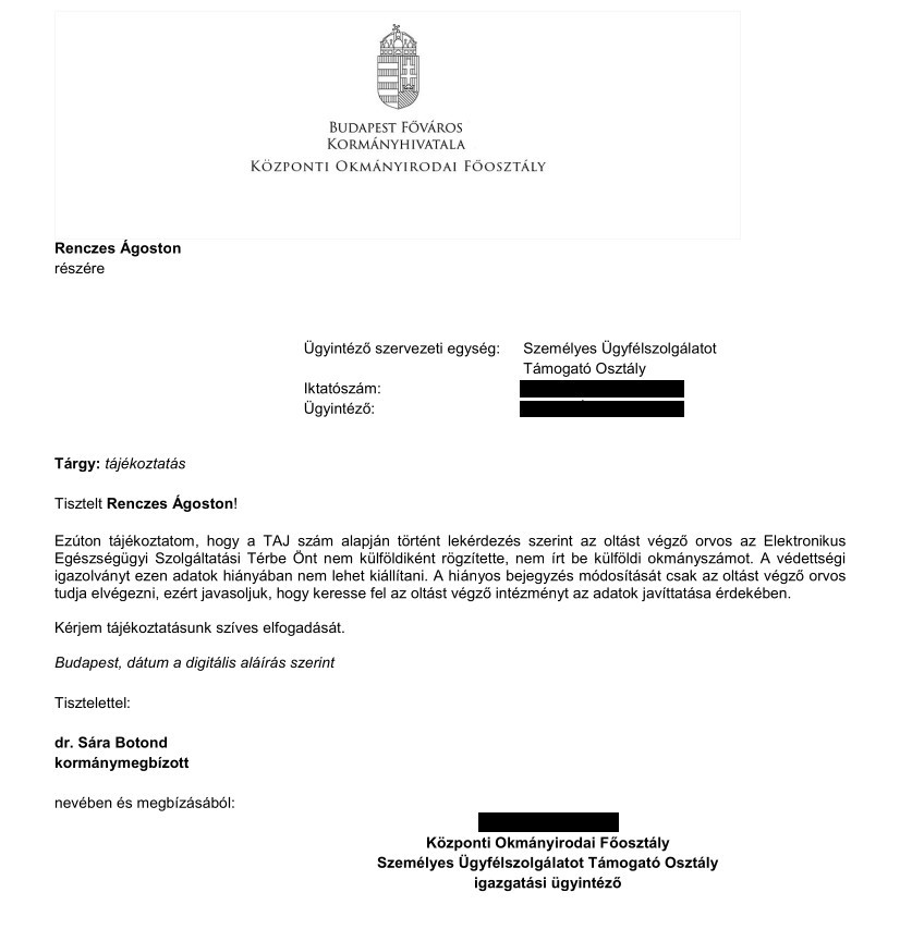 „Ezúton tájékoztatom, hogy a TAJ szám alapján történt lekérdezés szerint az oltást végző orvos az Elektronikus Egészségügyi Szolgáltatási Térbe Önt nem külföldiként rögzítette, nem írt be külföldi okmányszámot. A védettségi igazolványt ezen adatok hiányában nem lehet kiállítani. A hiányos bejegyzés módosítását csak az oltást végző orvos tudja elvégezni, ezért javasoljuk, hogy keresse fel az oltást végző intézményt az adatok javíttatása érdekében.”